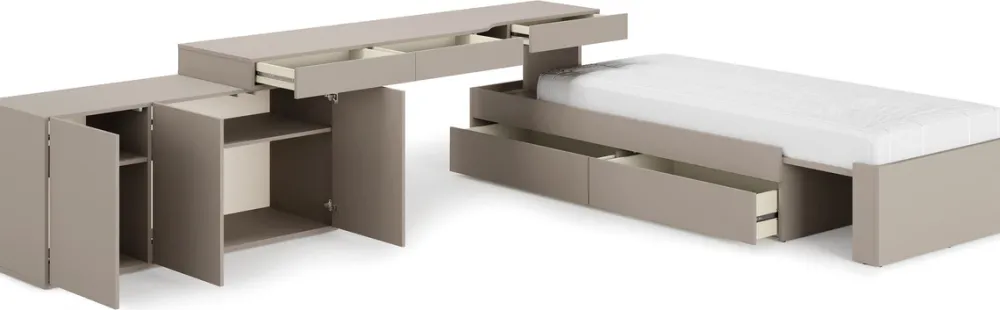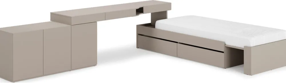 - Zestaw mebli młodzieżowych WOOW w kolorach szampański i clay gray to kompletne wyposażenie pokoju nastolatka. Biurko, komoda i łóżko zapewniają komfort nauki i odpoczynku, łącząc nowoczesny design z praktycznymi rozwiązaniami na lata.