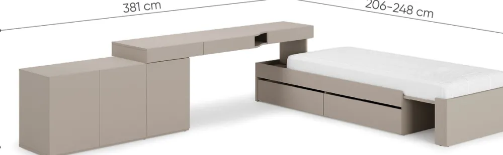 Zestaw mebli młodzieżowych WOOW to idealne rozwiązanie do pokoju ucznia lub nastolatka. Składający się z funkcjonalnego biurka (w wersji lewej), pojemnej komody i wygodnego łóżka, zestaw zapewnia kompleksowe wyposażenie, które wspiera rozwój, naukę i codzienny odpoczynek. Stonowana kolorystyka – szampański i clay gray – doskonale wpisuje się w nowoczesne i młodzieżowe wnętrza.