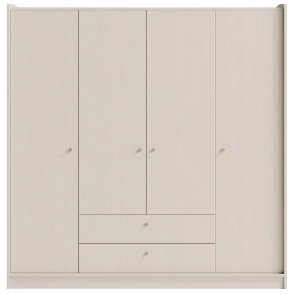- Szafa GAVIA 200 cm w kolorze beżu piaskowego to czterodrzwiowy model z dwoma szufladami, drążkiem i półkami. Złote uchwyty i prosty design łączą elegancję z funkcjonalnością, idealną do nowoczesnych i klasycznych wnętrz.