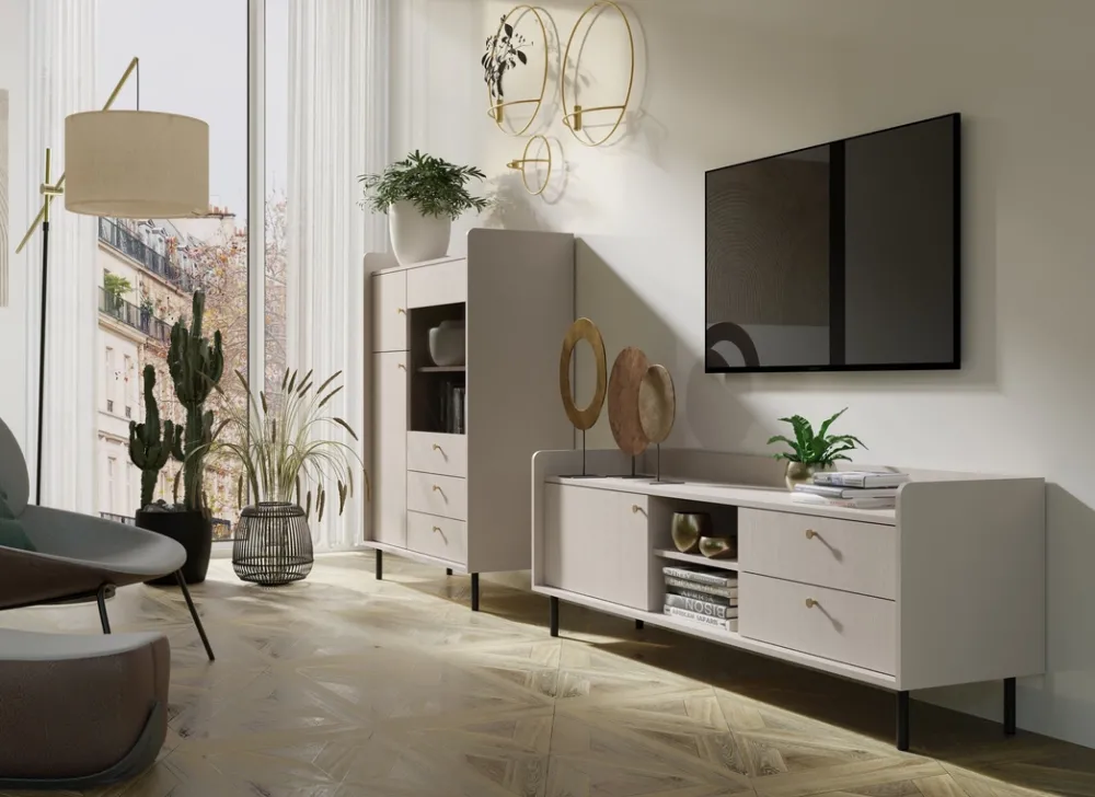 Szafa czterodrzwiowa GAVIA to propozycja dla osób, które szukają połączenia nowoczesnego designu z dużą ilością miejsca do przechowywania. Jasne wykończenie w odcieniu beżu piaskowego wnosi do wnętrza świeżość i lekkość, a złote, metalowe uchwyty dodają całości subtelnego szyku. Ten funkcjonalny mebel świetnie sprawdzi się wszędzie tam, gdzie liczy się zarówno styl, jak i praktyczność.