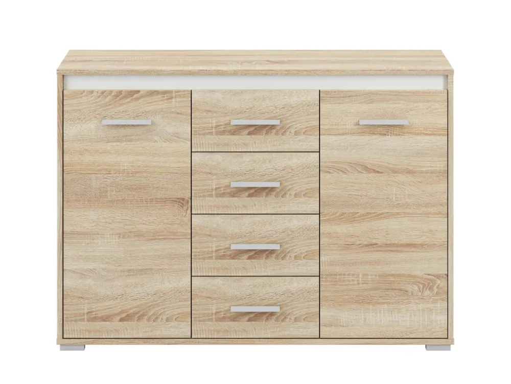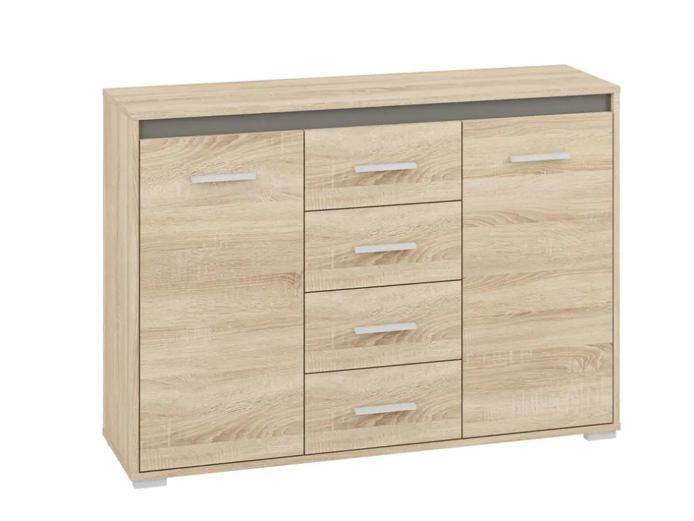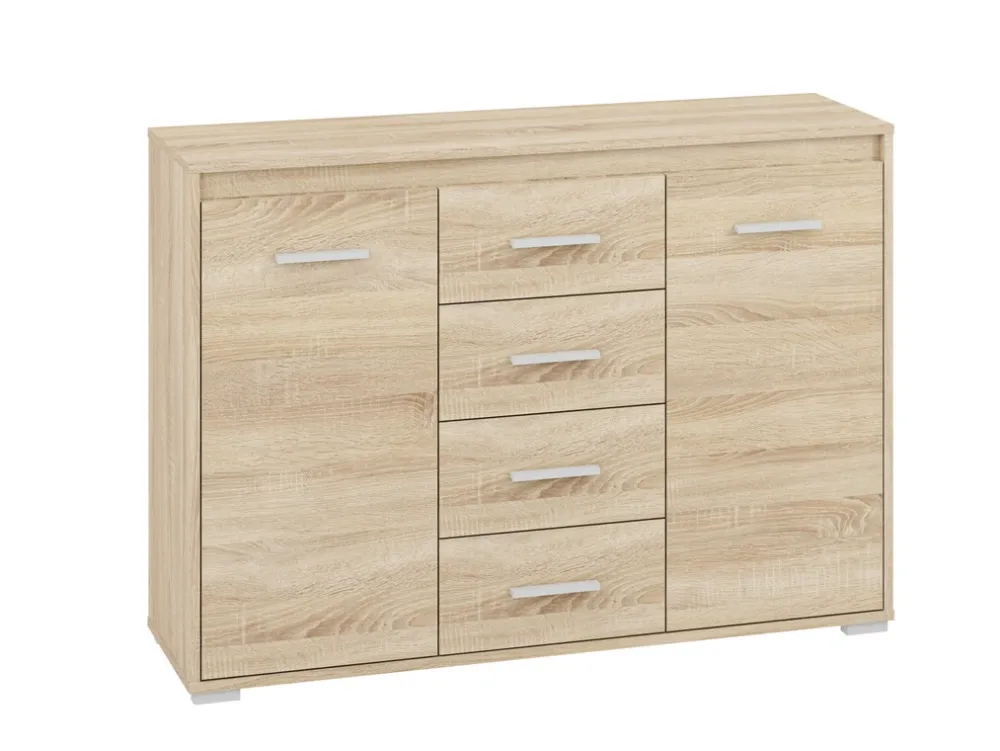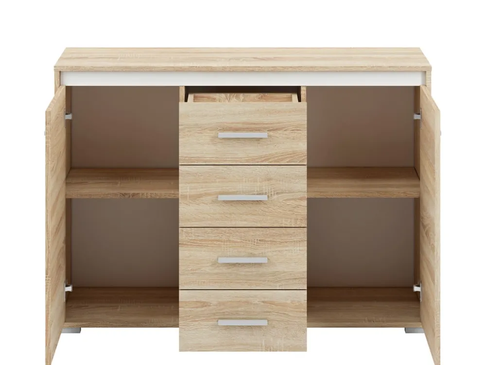 Komoda została zaprojektowana z myślą o maksymalnym wykorzystaniu dostępnej przestrzeni. Po lewej i prawej stronie znajdują się drzwi, za którymi kryją się praktyczne półki. Idealne do przechowywania większych przedmiotów, takich jak pościel, ręczniki czy dokumenty. W centralnej części komody znajdują się cztery pojemne szuflady, które ułatwią organizację drobniejszych przedmiotów – od bielizny po akcesoria kuchenne.