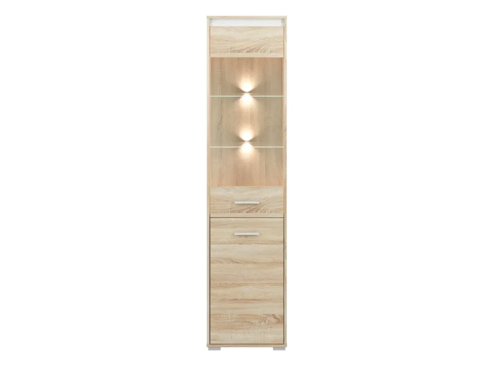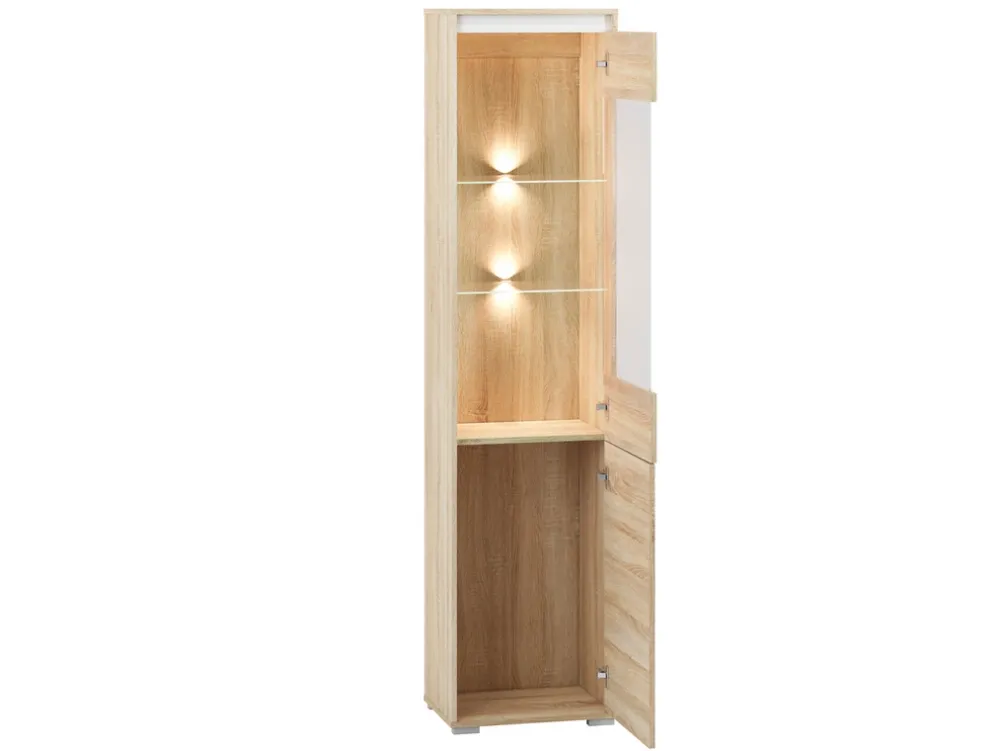 - Witryna do salonu AVO w kolorze dąb sonoma posiada trzy półki wykonane z pyty laminowanej oraz dwie szklane, które dzięki zastosowanej szybie doskonale sprawdzą się na eksponowanie porcelany. Witryna posiada obrzeża wykończone okleiną ABS.