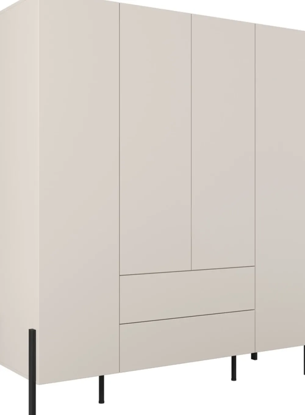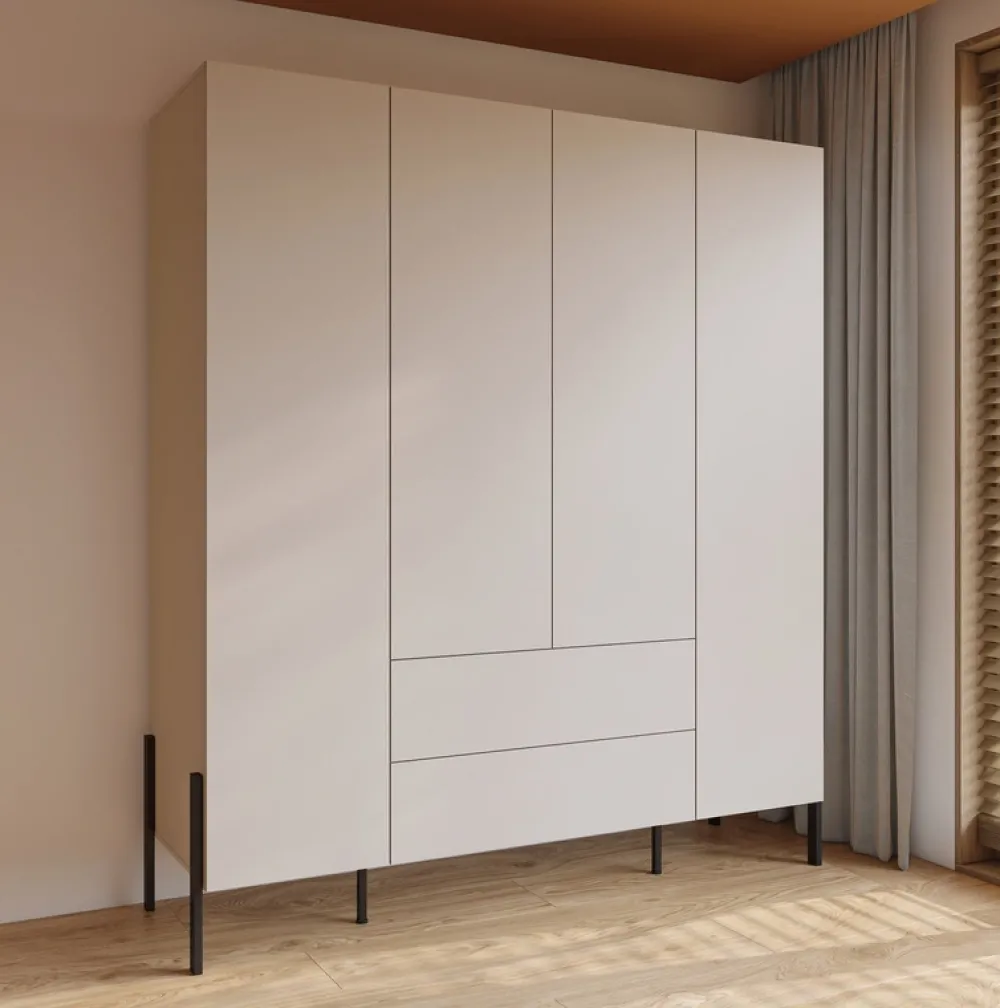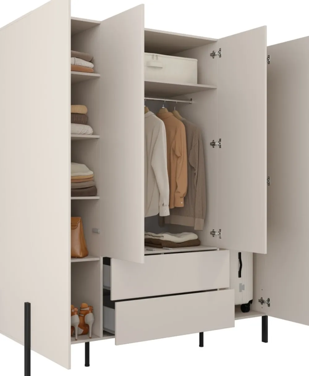 Przestronna szafa czterodrzwiowa to idealne rozwiązanie do nowoczesnych wnętrz, w których liczy się estetyka i praktyczność. Dzięki przemyślanej konstrukcji z drążkiem, półkami i dwiema pojemnymi szufladami bez trudu pomieści ubrania, akcesoria i tekstylia domowe. Jasna kolorystyka w odcieniu kaszmiru w połączeniu z czarnymi, metalowymi nogami nadaje meblowi elegancki, lekki wygląd i ponadczasowy styl.