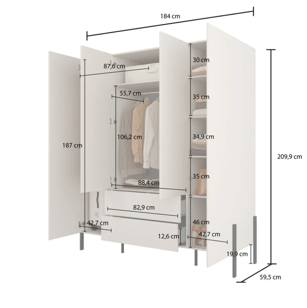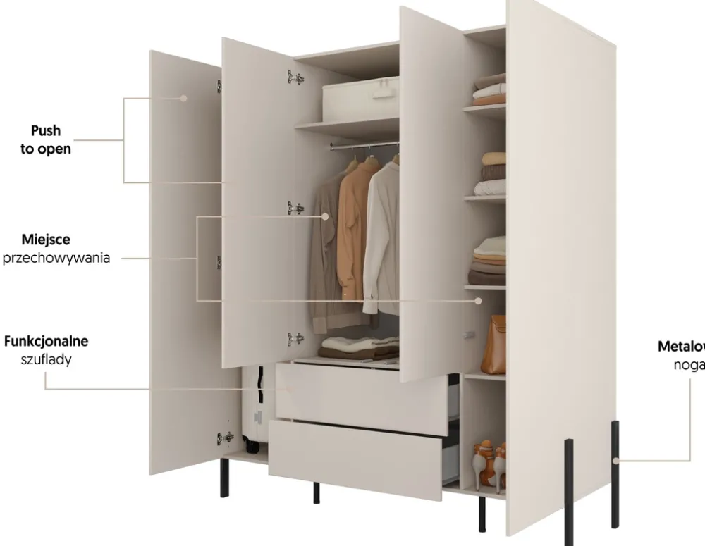 - Szafa czterodrzwiowa kaszmir z systemem push to open. Wykonana z płyty laminowanej 15 mm, posiada drążek na wieszaki, półki boczne i dwie szuflady. Metalowe nogi w kolorze czarnym, stabilna konstrukcja. Wymiary: 184×209,9×59,5 cm. Montaż samodzielny.