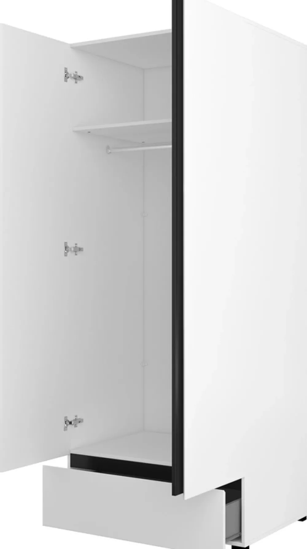 Szafa została zaprojektowana z myślą o wygodzie codziennego użytkowania. Dwa niezależne segmenty z półkami i drążkami pozwalają na uporządkowane przechowywanie różnorodnej odzieży – od garniturów po płaszcze i bluzy. Pojemna szuflada osadzona na rolkowych prowadnicach ułatwia dostęp do przechowywanych rzeczy, zapewniając płynne otwieranie nawet przy dużym obciążeniu.