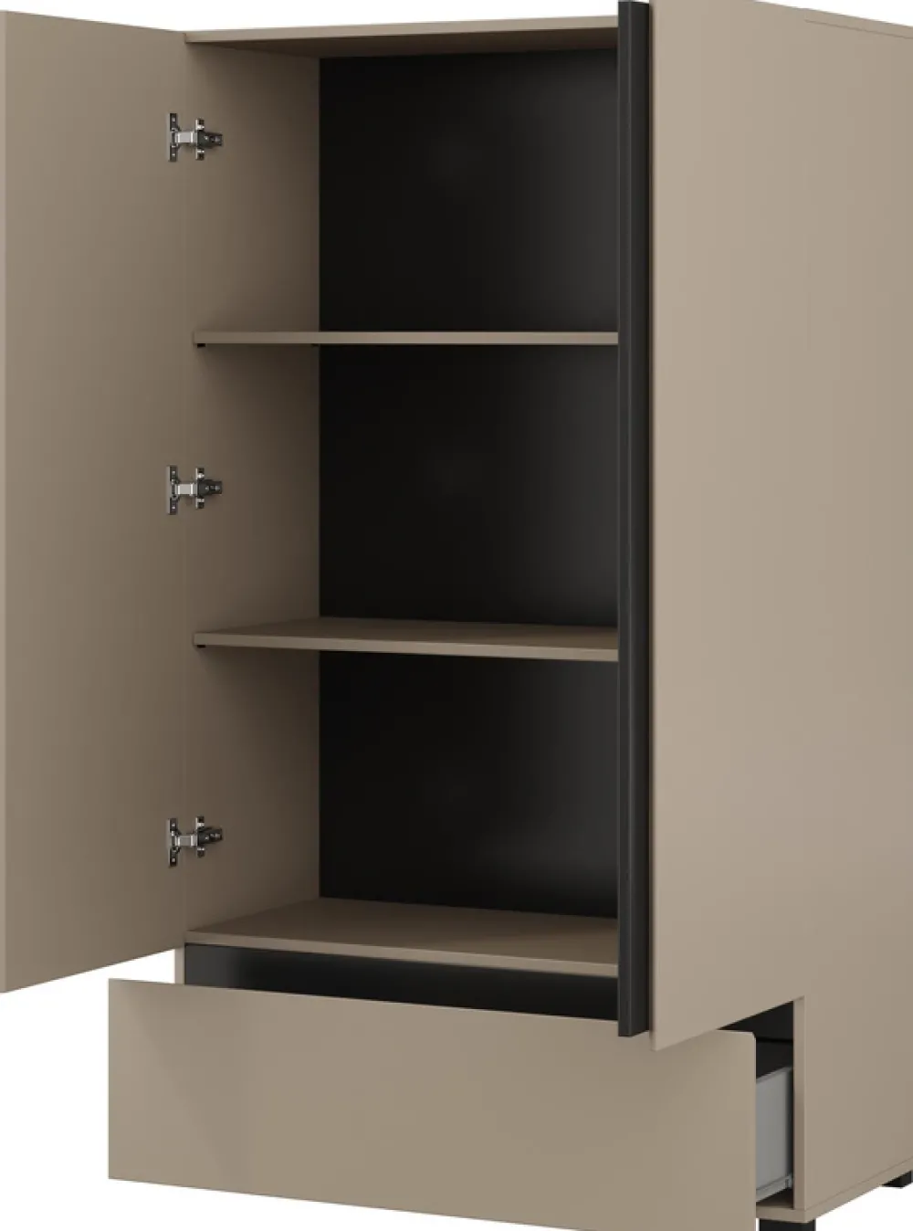 Trzy wewnętrzne półki za drzwiami zapewniają przejrzystą organizację przestrzeni i łatwy dostęp do zawartości. U dołu znajduje się funkcjonalna, głęboka szuflada, osadzona na prowadnicach rolkowych, co zapewnia ciche i lekkie działanie nawet przy większym obciążeniu.