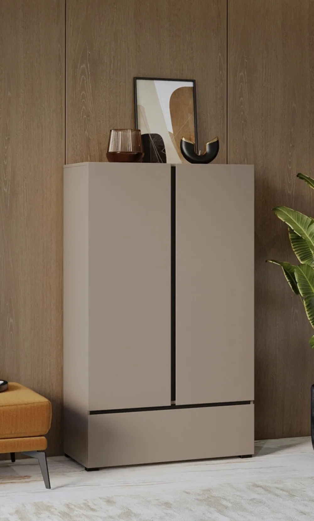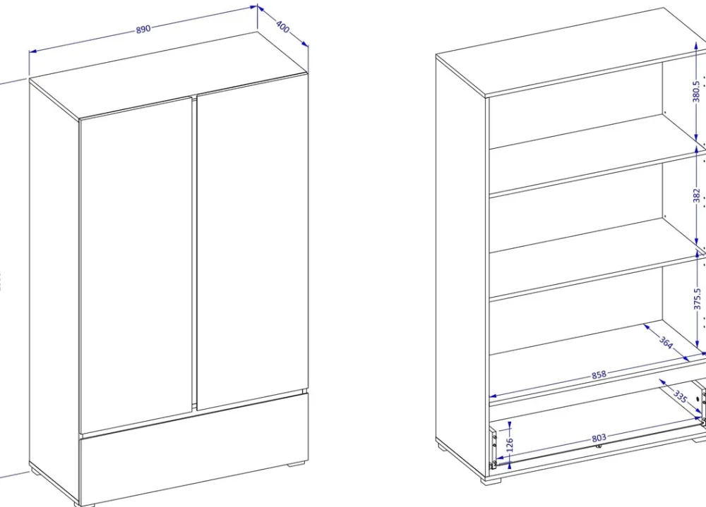 ✅ Dwoje drzwi z trzema półkami – idealne miejsce na pościel, ręczniki lub dokumenty.