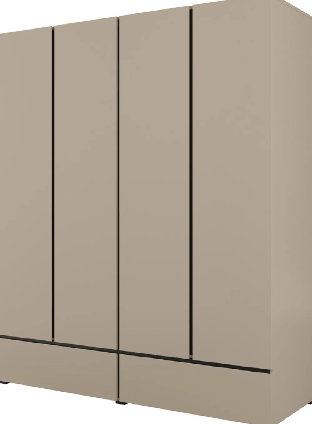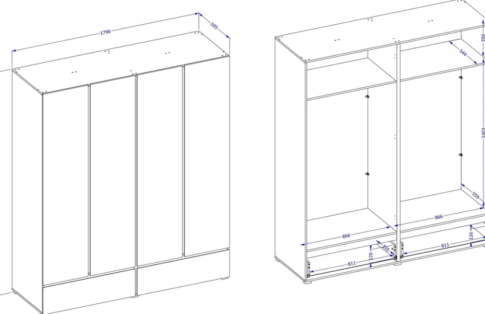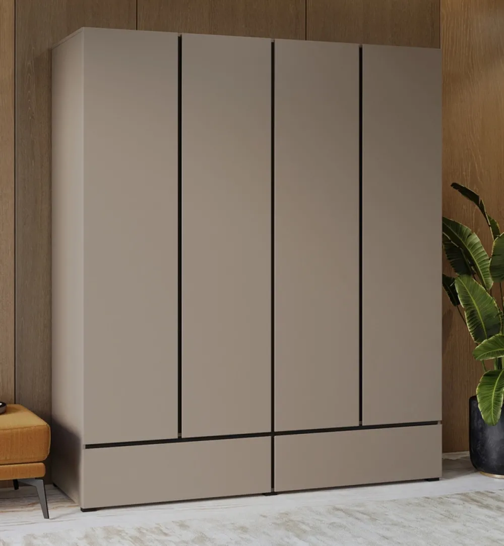 Szafa została zaprojektowana z myślą o maksymalnej pojemności i wygodzie użytkowania. Dzięki czterem drzwiom, dwóm półkom i czterem drążkom możesz przechowywać odzież sezonową, codzienną oraz galową w przejrzysty sposób. Dwie dolne szuflady osadzone na rolkowych prowadnicach zapewniają komfortowy dostęp do akcesoriów, bielizny czy dokumentów.