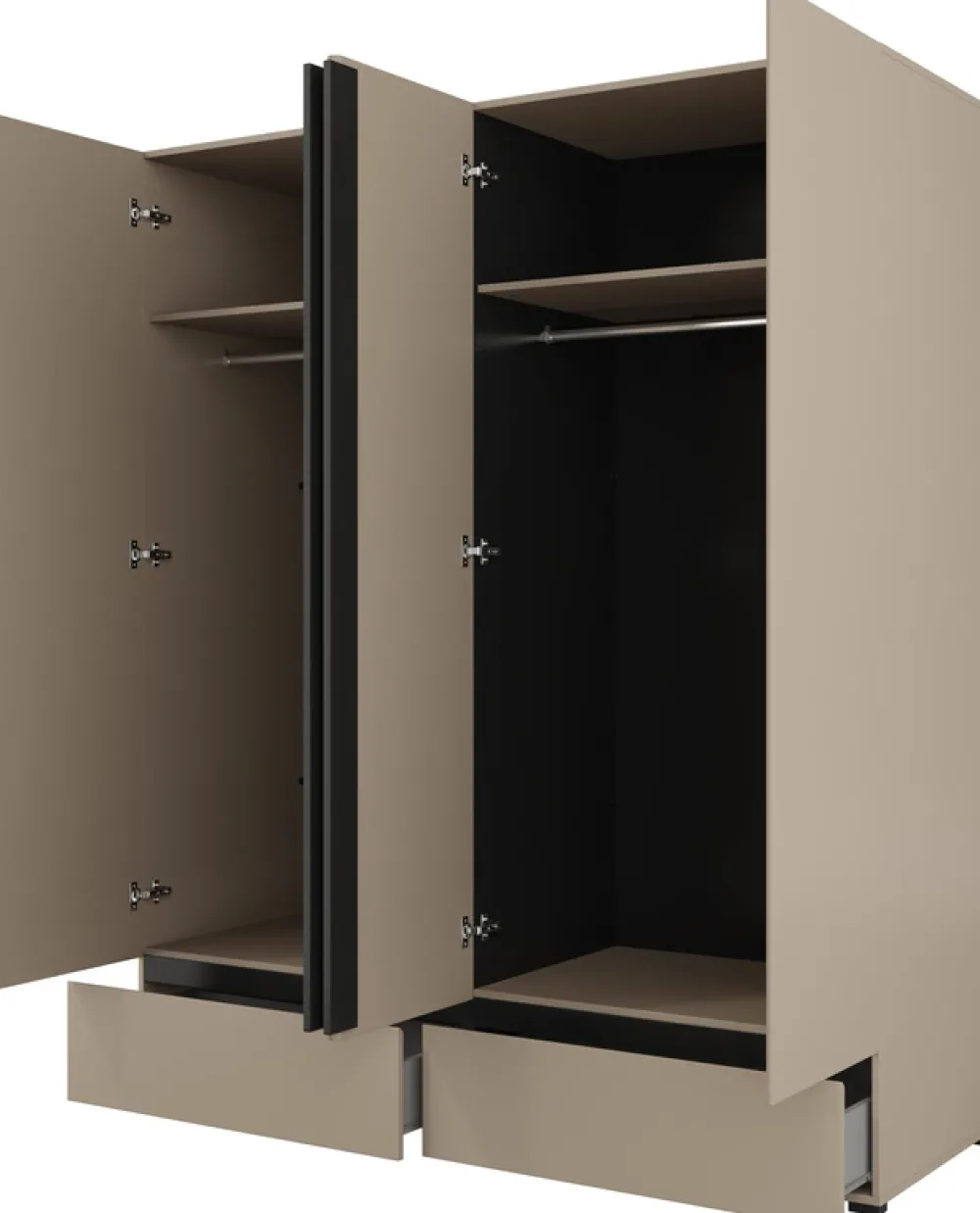 ✅ Cztery drzwi z półkami i drążkami – dwa niezależne segmenty idealne do organizacji ubrań wiszących i składanych.
