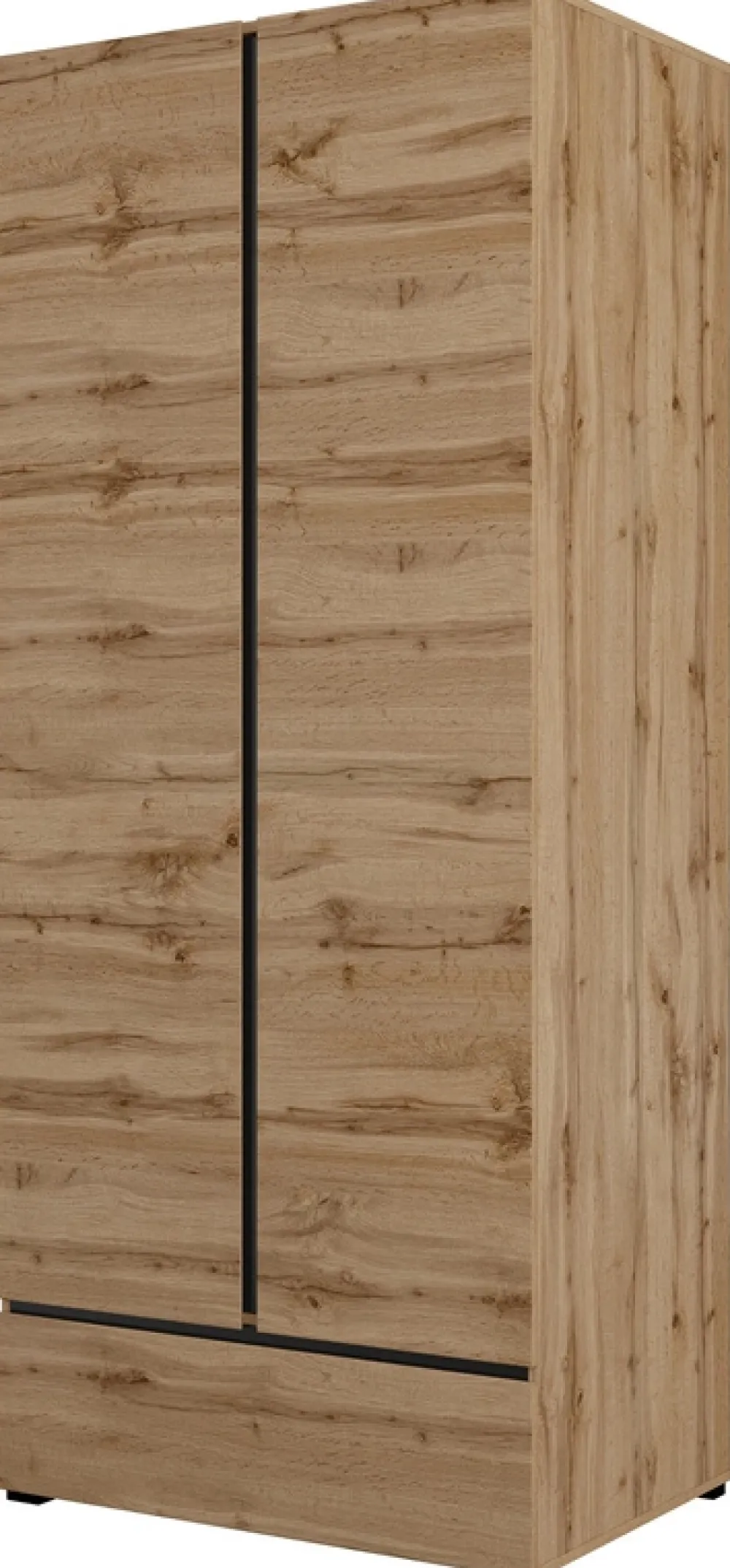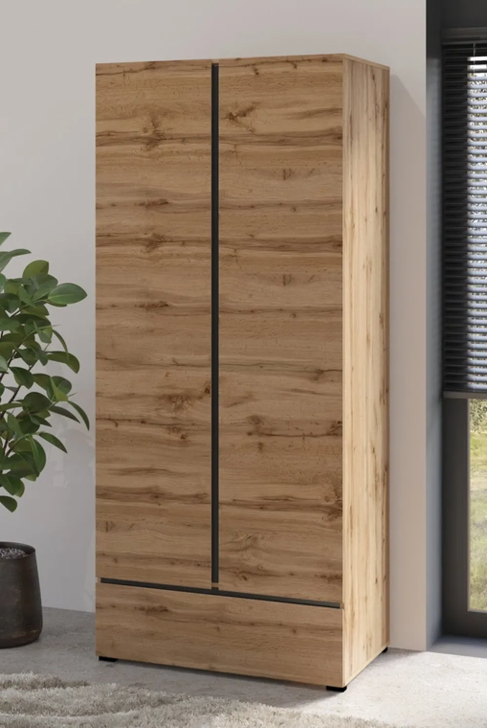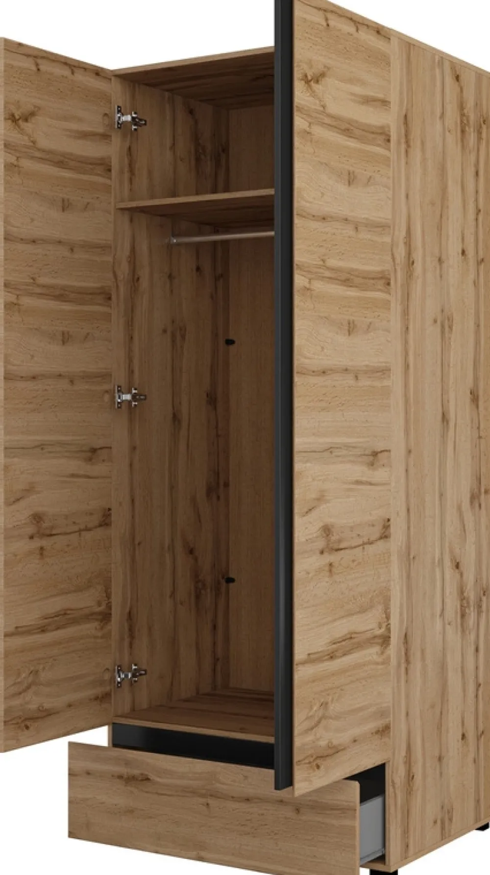 Szafa została zaprojektowana z myślą o wygodzie codziennego użytkowania. Dwa niezależne segmenty z półkami i drążkami pozwalają na uporządkowane przechowywanie różnorodnej odzieży – od garniturów po płaszcze i bluzy. Pojemna szuflada osadzona na rolkowych prowadnicach ułatwia dostęp do przechowywanych rzeczy, zapewniając płynne otwieranie nawet przy dużym obciążeniu.