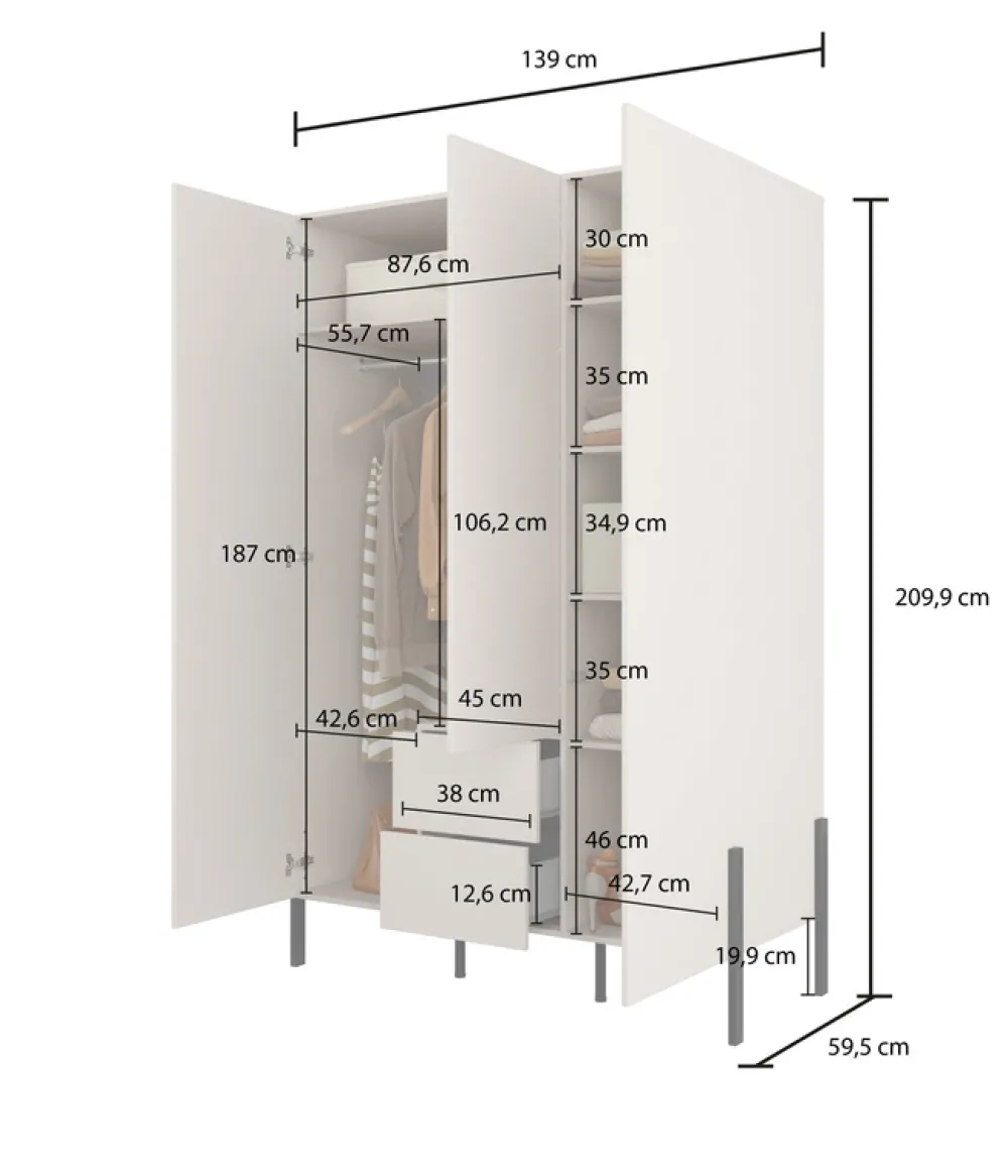 - Wymiary: szerokość 139 cm, wysokość 209,9 cm, głębokość 59,5 cm
