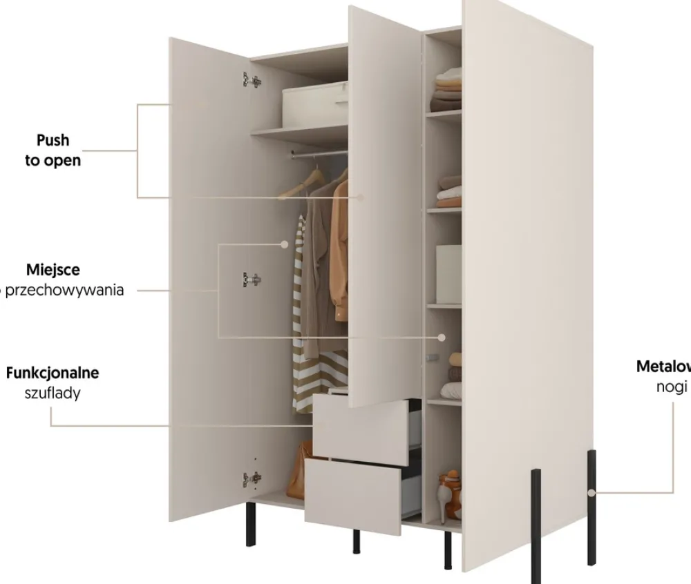 Nowoczesna szafa trzydrzwiowa to perfekcyjne połączenie estetyki, przestronności i praktycznych rozwiązań do codziennego użytku. Dzięki przemyślanemu układowi wnętrza z drążkiem, półkami oraz dwiema pojemnymi szufladami, z łatwością uporządkujesz odzież, buty i akcesoria. Subtelny kolor kaszmiru oraz solidne, czarne nogi z metalu sprawiają, że szafa doskonale wpisuje się w nowoczesne, minimalistyczne i skandynawskie aranżacje.