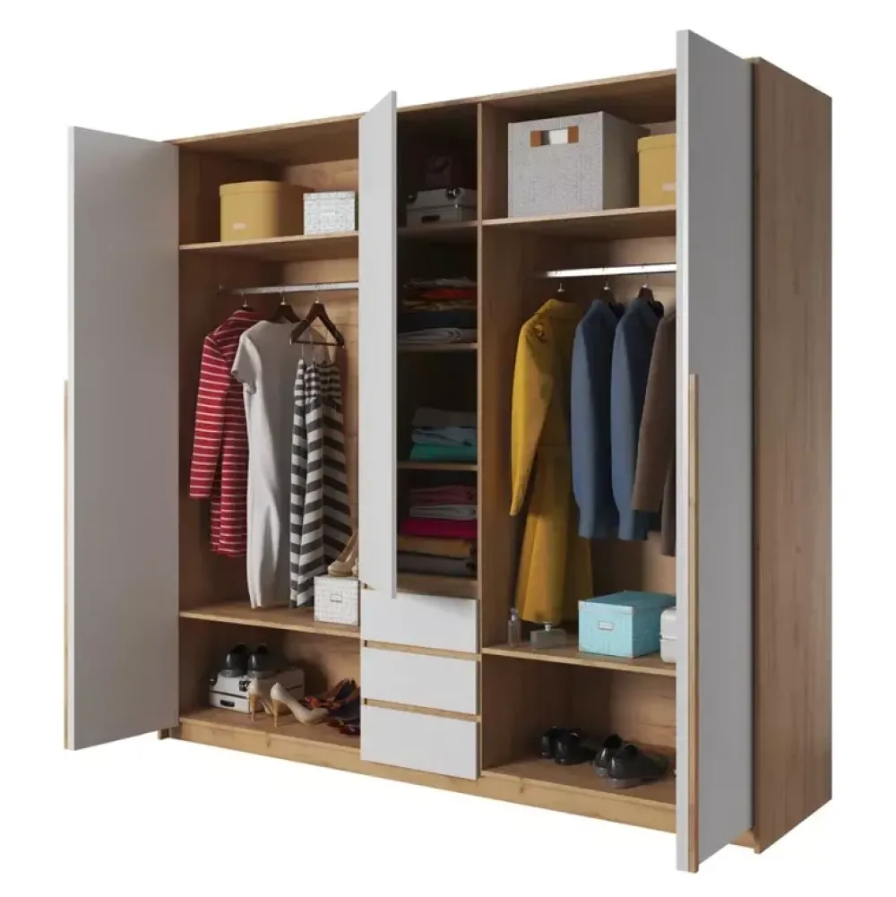 Szafa do sypialni wyposażona w półki, szuflady i drążki na wieszaki.