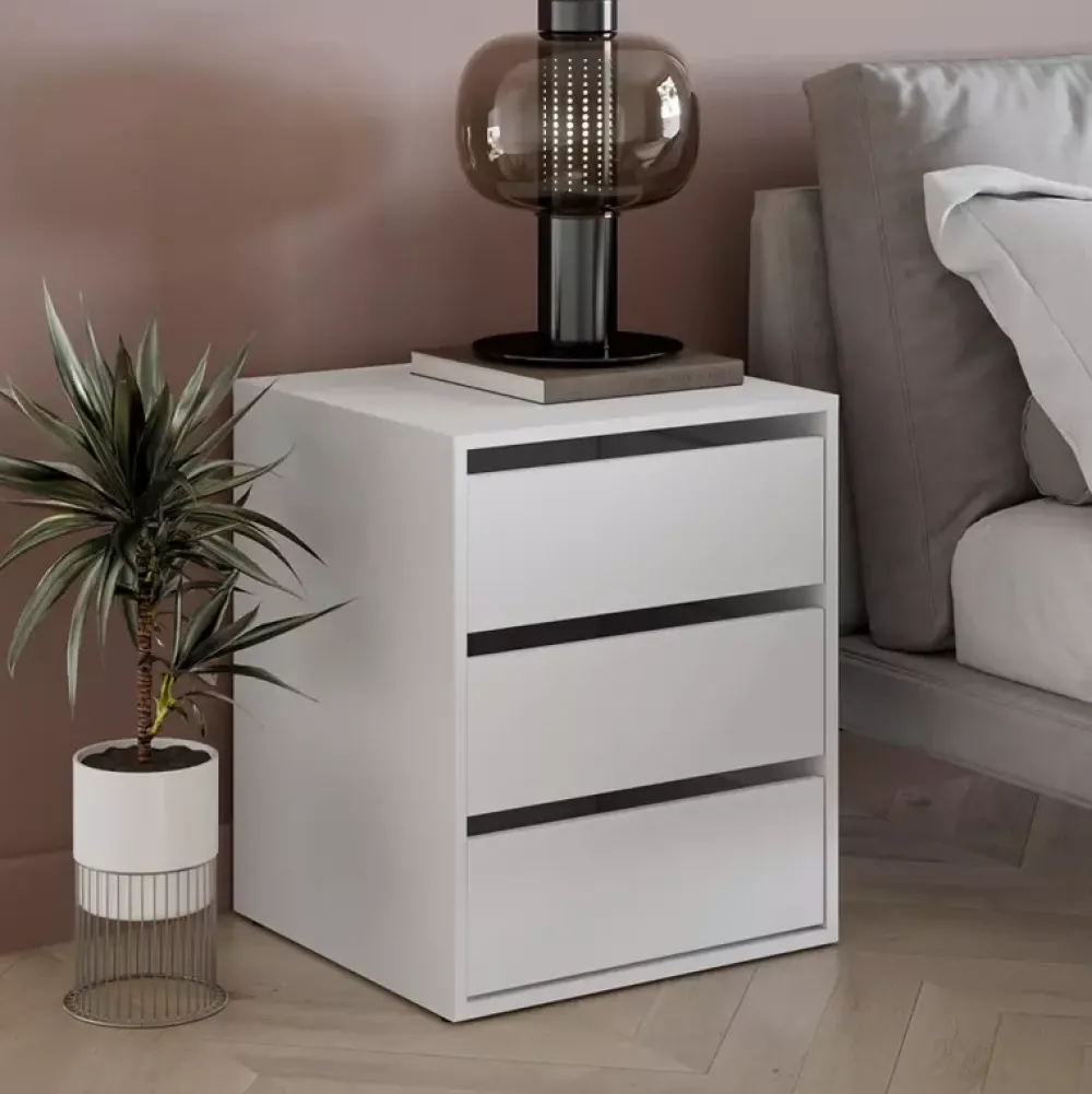 Szafka nocna składa się z trzech szuflad, która umieszczona jest na prowadnicach rolkowych, co zapewnia płynne i ciche otwieranie i zamykanie szuflady. Obrzeża szafki zostały zabezpieczone okleiną ABS, co zwiększa ich trwałość i odporność na uszkodzenia mechaniczne. Nowoczesna stylistyka szafki nocnej sprawia, że idealnie pasuje do wielu aranżacji wnętrz, zarówno tych minimalistycznych, jak i bardziej eleganckich.