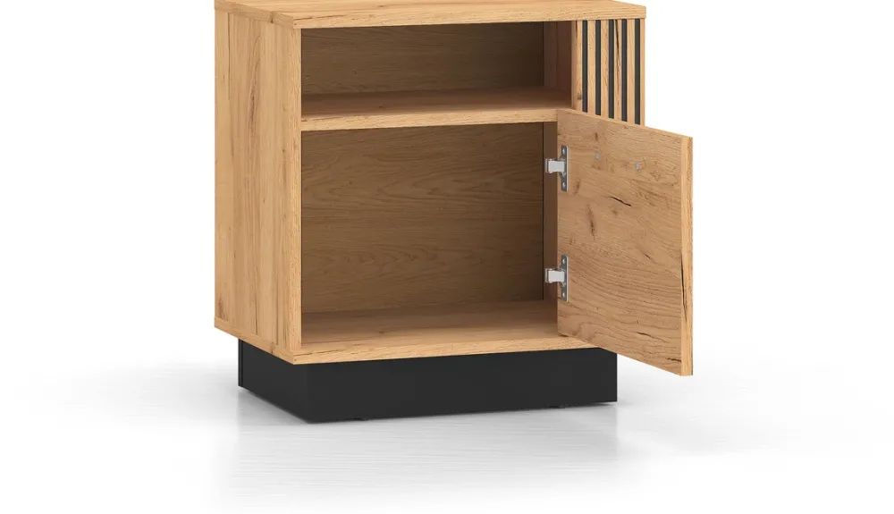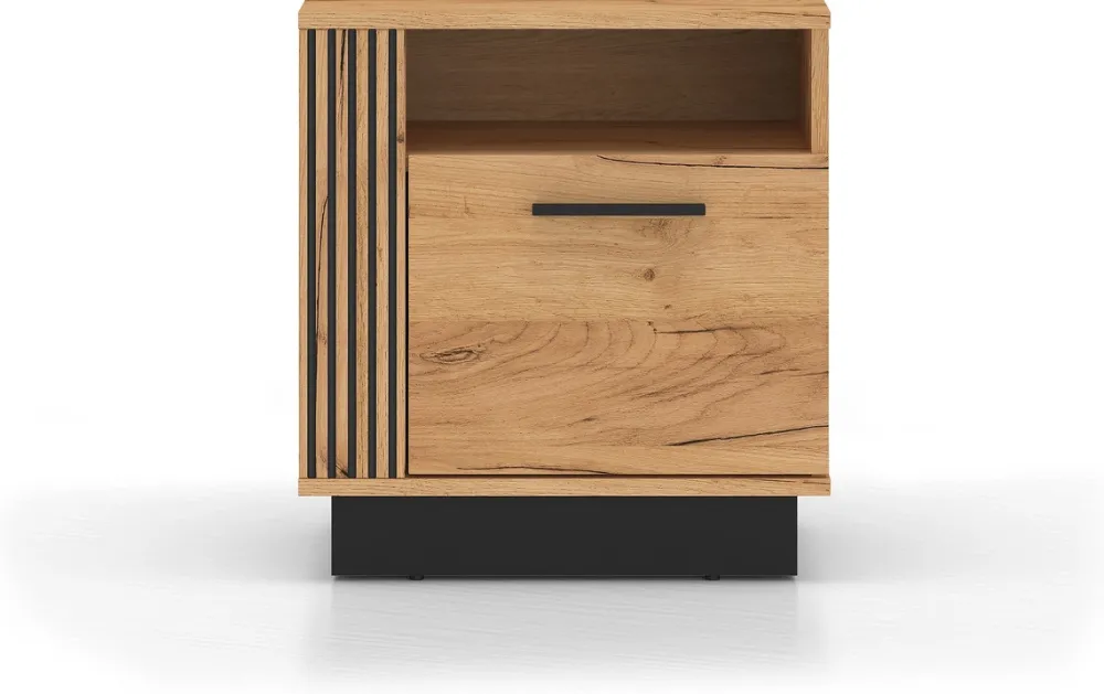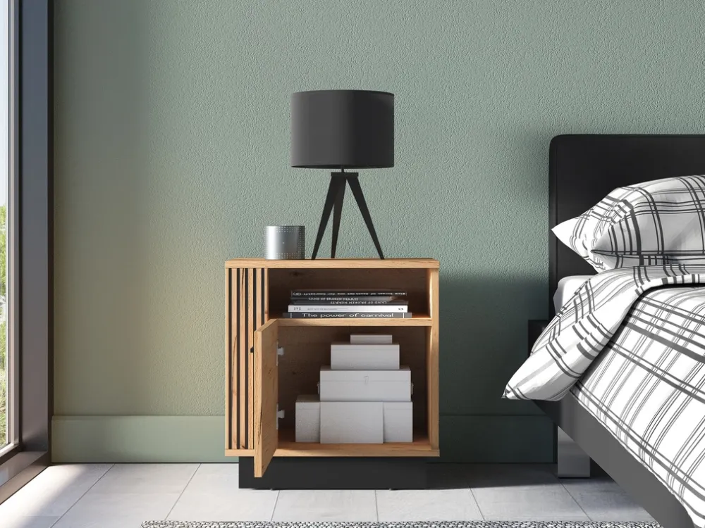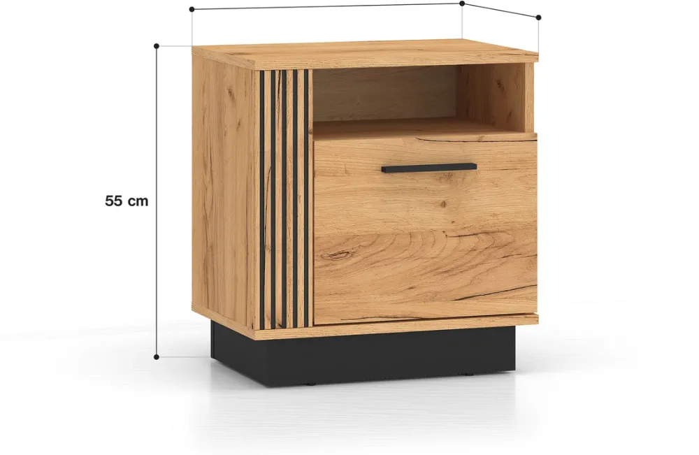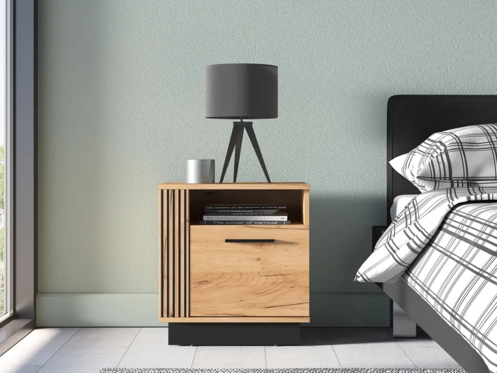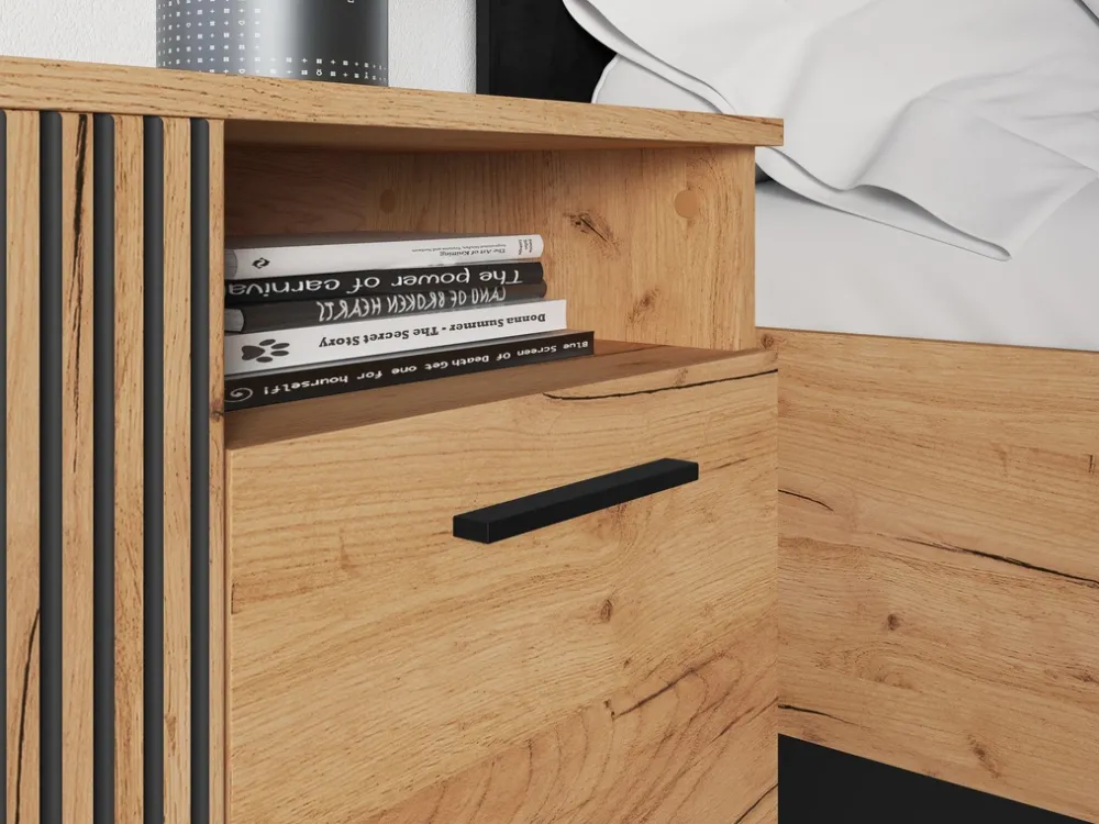 Ta funkcjonalna szafka nocna o szerokości 50 cm to doskonałe uzupełnienie nowoczesnej sypialni. Łączy w sobie elegancki design, inspirowany stylem loftowym, z praktycznymi rozwiązaniami do codziennego użytku. Połączenie dekoru dąb craft złoty z czarnymi detalami oraz subtelne lamele tworzą niepowtarzalny efekt wizualny, który doskonale współgra z innymi meblami z tej samej kolekcji.
