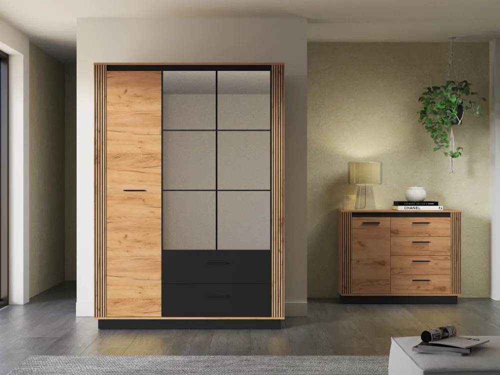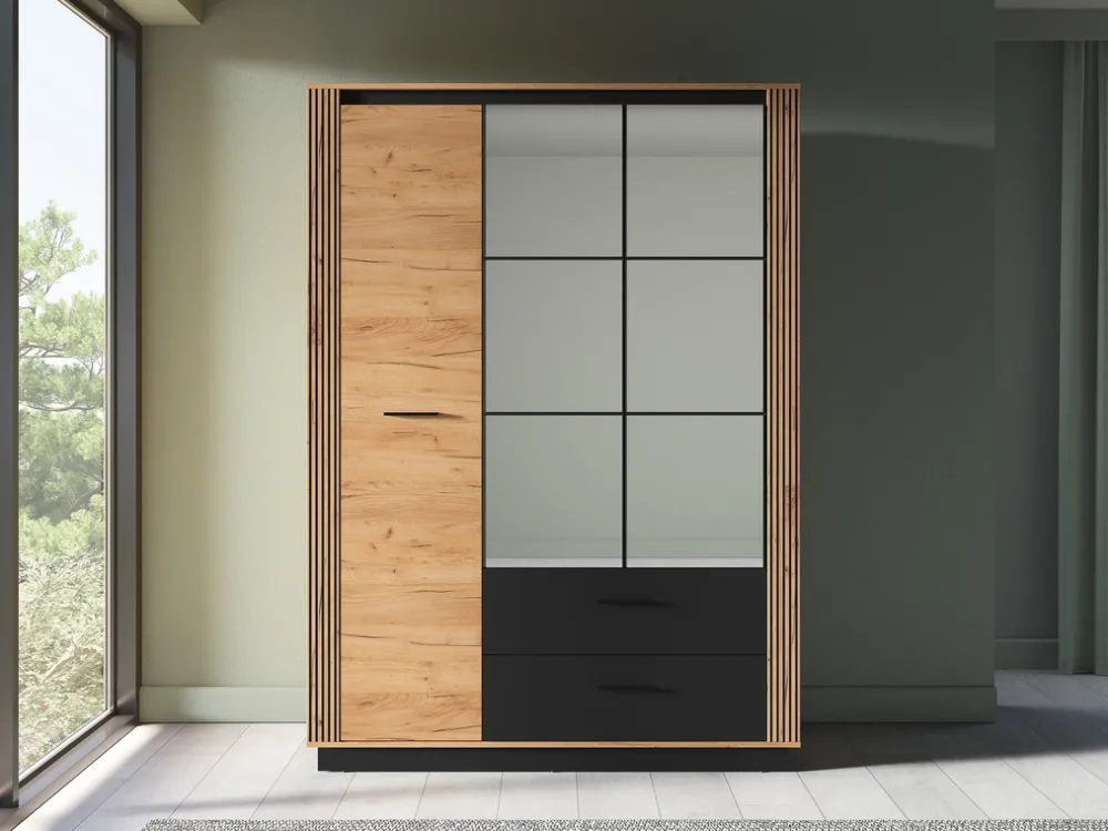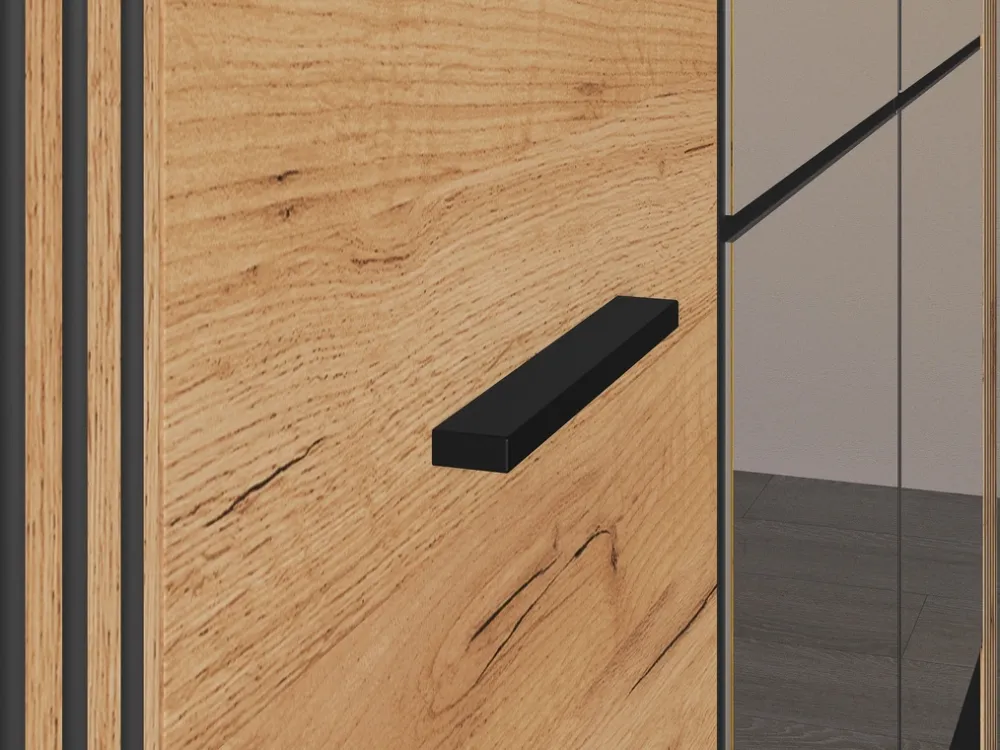 Ta elegancka szafa trzydrzwiowa to doskonałe połączenie funkcjonalności i modnego designu. W dekorze dąb craft złoty z kontrastującymi czarnymi akcentami i lustrzanym frontem, mebel idealnie wpisuje się w nowoczesne wnętrza. Dzięki podziałowi na przestrzeń półkową i drążek na ubrania wiszące, szafa pomoże uporządkować każdy element garderoby.