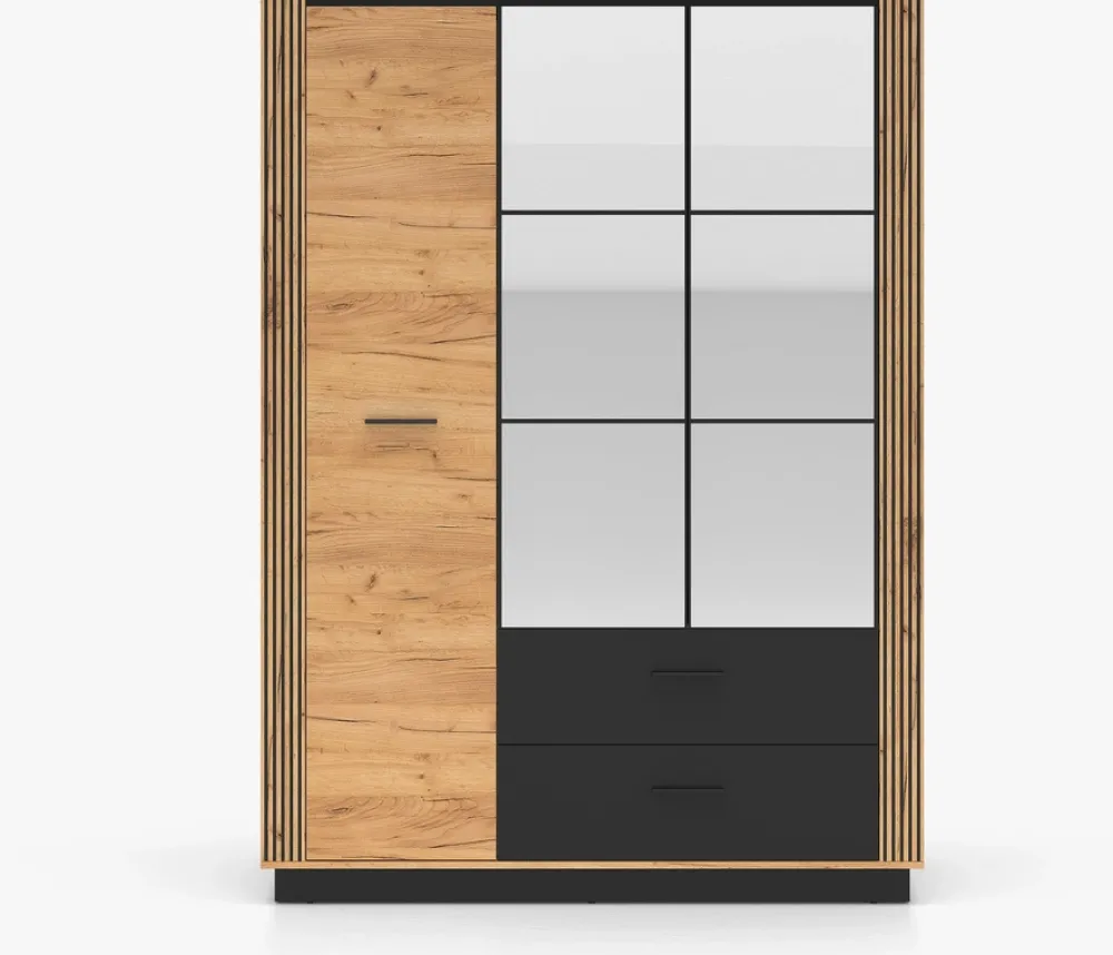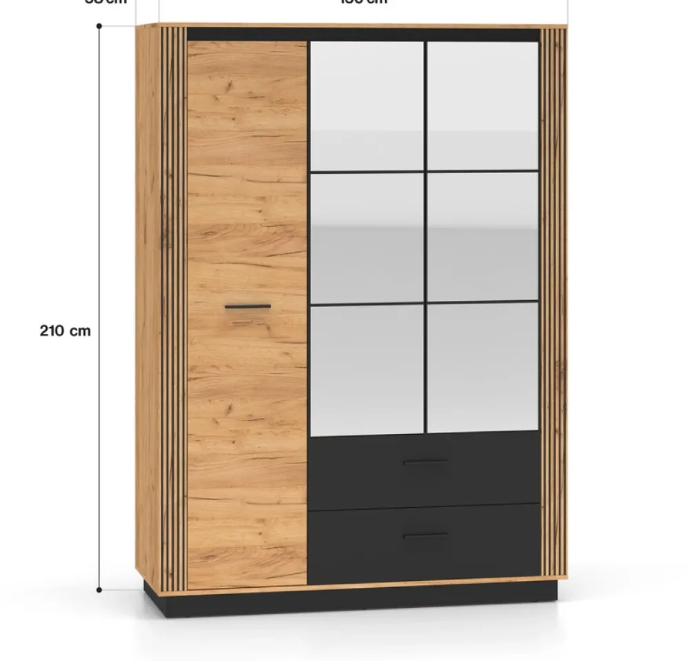 Szafa wykonana jest z wysokiej jakości laminowanej płyty meblowej odpornej na zarysowania, wilgoć i wysoką temperaturę. Krawędzie zabezpieczone obrzeżem ABS, metalowe uchwyty w kolorze czarnym i hartowane szkło tworzą trwały, a jednocześnie elegancki mebel do każdego wnętrza.