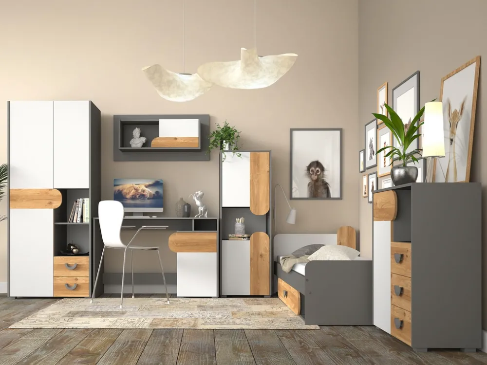 Prezentujemy wyjątkową komodę COOLIFY, idealnie wpasowującą się w potrzeby i gusty młodzieżowego pokoju. Zaprojektowana z myślą o dynamicznym stylu życia młodych ludzi, łączy w sobie nowoczesny design z funkcjonalnością. Wykonana z wysokiej jakości płyty laminowanej o grubości 16 mm, gwarantuje trwałość i odporność na codzienne użytkowanie.