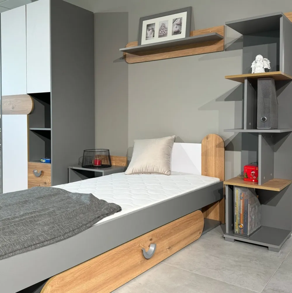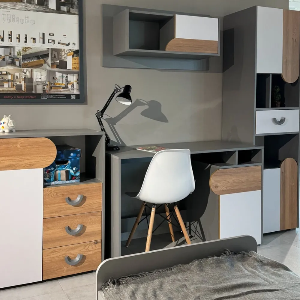 Kolorystyka dąb nash, połączona z elementami w kolorze grafitu oraz białym brylantowym, nadaje komodzie elegancki, a zarazem świeży wygląd. Taka paleta barw doskonale komponuje się z różnorodnymi aranżacjami wnętrz, wprowadzając do pokoju młodzieżowego ciepło i nowoczesność.