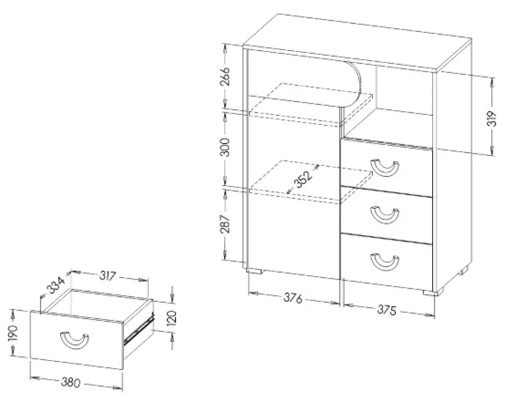Komoda wyposażona jest w trzy funkcjonalne szuflady na prowadnicach kulkowych, które zapewniają płynne otwieranie. Trzy dodatkowe półki oferują przestrzeń do przechowywania książek, gier czy innych przedmiotów. Krawędzie mebla zostały zabezpieczone obrzeżem PCV, co zwiększa jego trwałość i bezpieczeństwo użytkowania. Nóżki i uchwyty wykonane z tworzywa sztucznego w kolorze grafitu podkreślają nowoczesny charakter komody, jednocześnie zapewniając jej stabilność i łatwość w utrzymaniu.