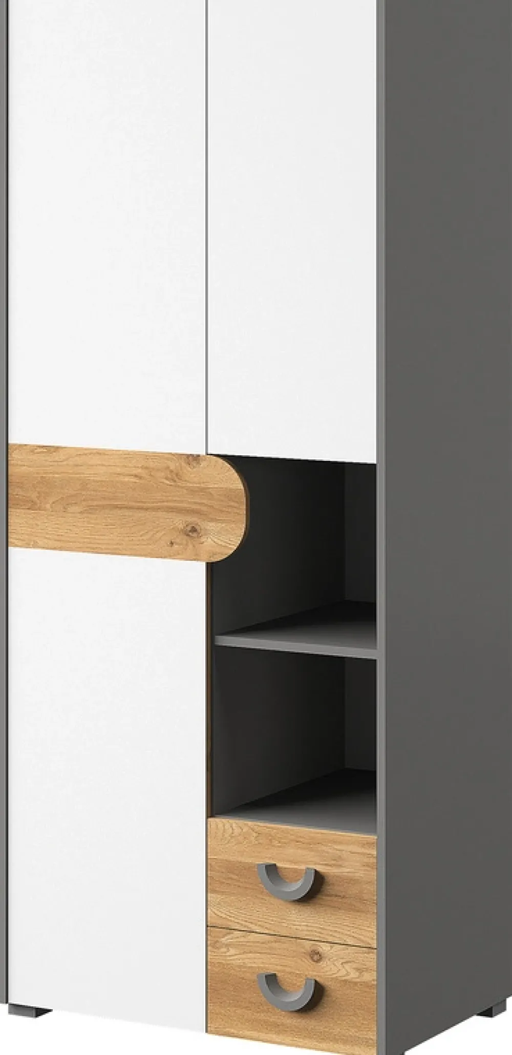 Kolorystyka zestawu mebli łączy w sobie elegancki dąb nash, biały brylantowy oraz grafit, tworząc spójną i harmonijną paletę barw, która wprowadza do pokoju młodzieżowego ciepło i nowoczesny charakter. Neutralne, ale wyrafinowane odcienie dębu nash doskonale komponują się z jasnością białego brylantowego, tworząc przytulną atmosferę. Grafitowe akcenty, zarówno w detalach, jak i w wykończeniach, dodają zestawowi nowoczesnej elegancji i charakteru, co sprawia, że meble te będą pasować do wielu aranżacji i stylów wnętrzarskich.