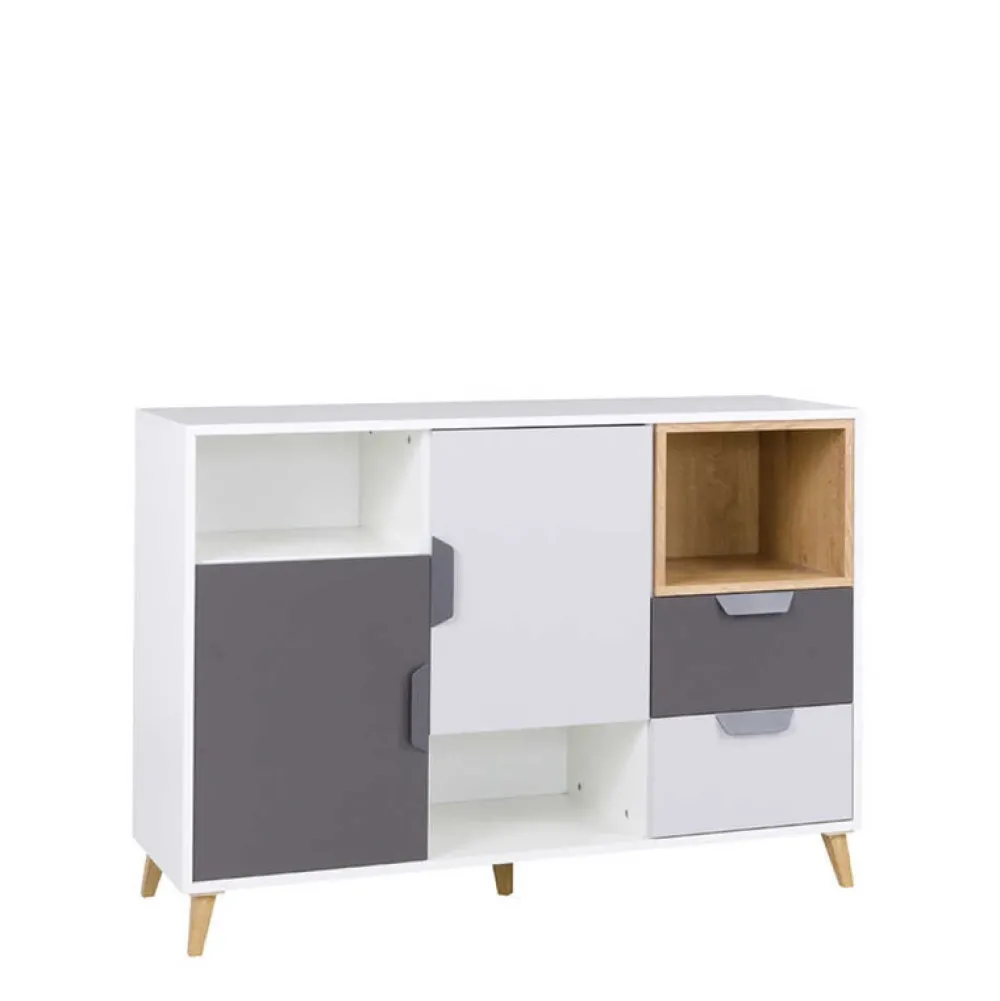 - Komoda ma 120 cm szerokości i została wyposażona w dwie szuflady oraz otwarte i zamykane półki.