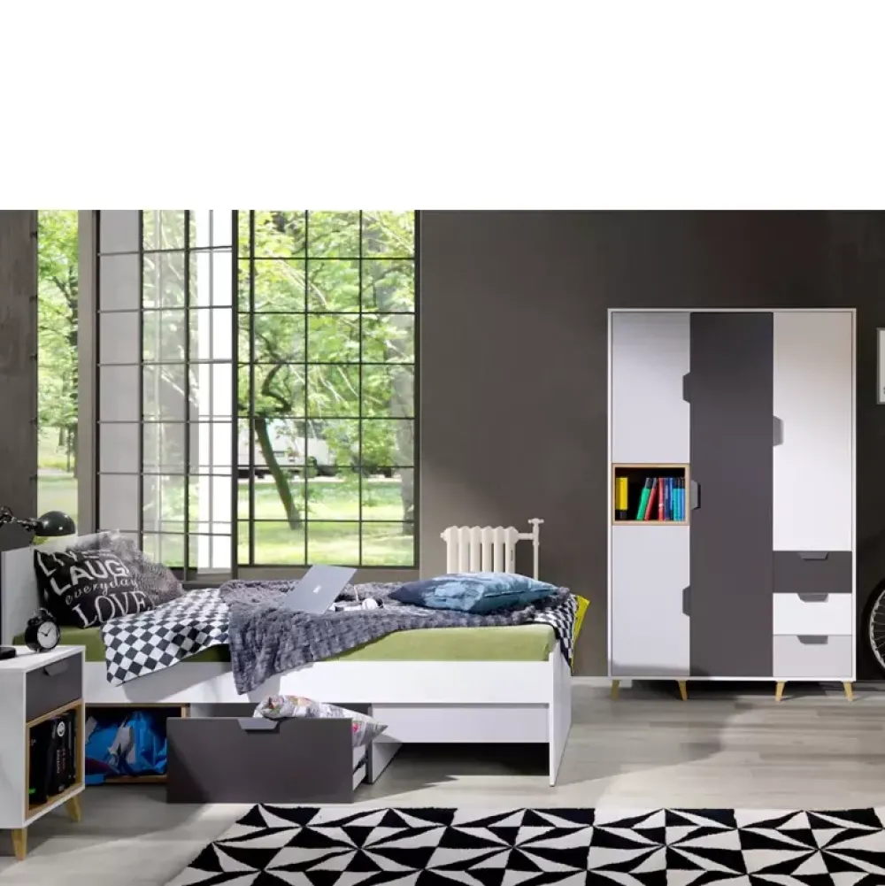 - W zestawie znajdują się; szafa na ubrania wyposażona w półki, szuflady i drążek na wieszaki; stolik nocny z szufladą oraz łóżko 90×200 bez materaca.