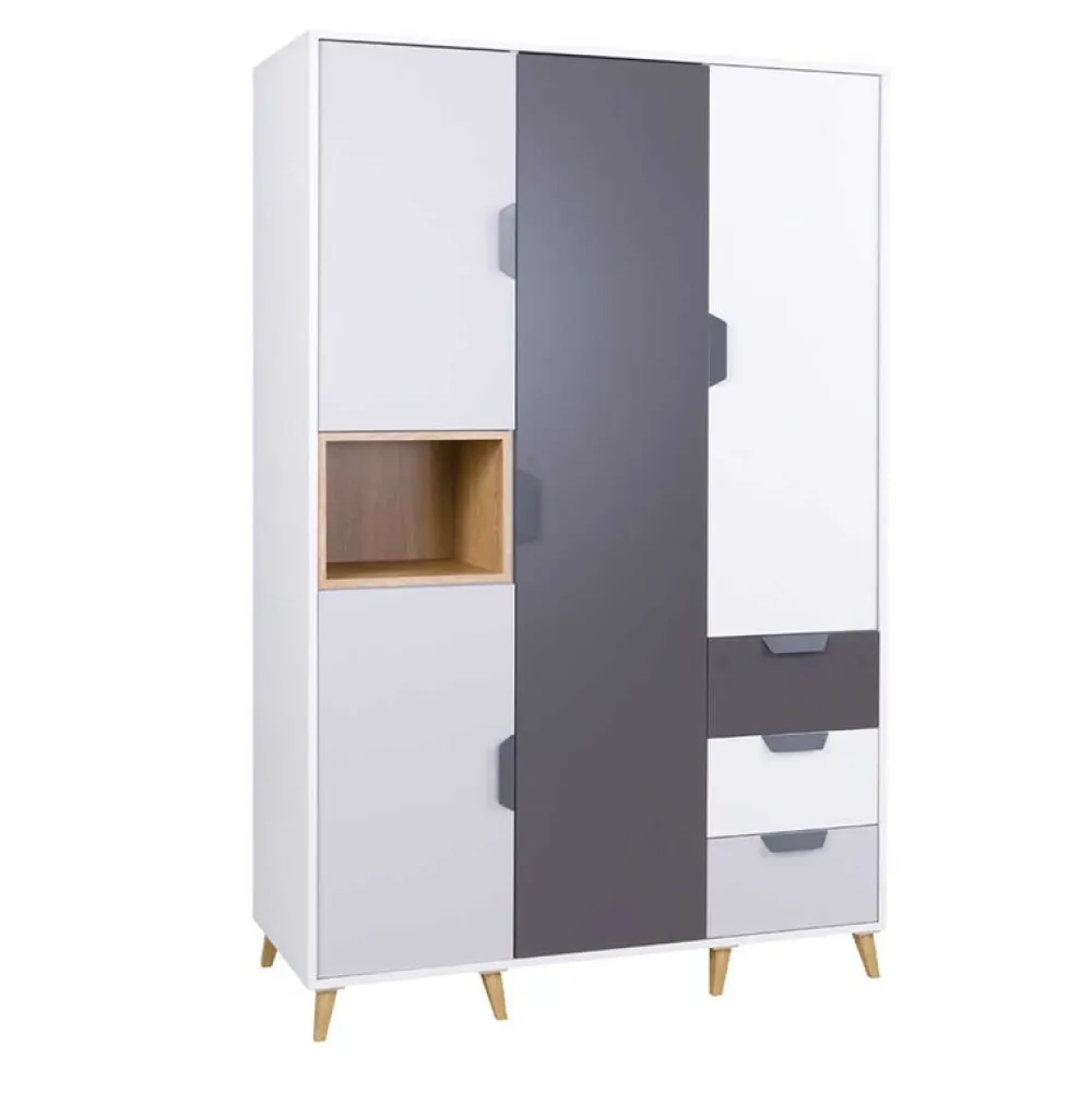 - Szafa na ubrania wyposażona w 9 półek, 3 szuflady i drążek na wieszaki;