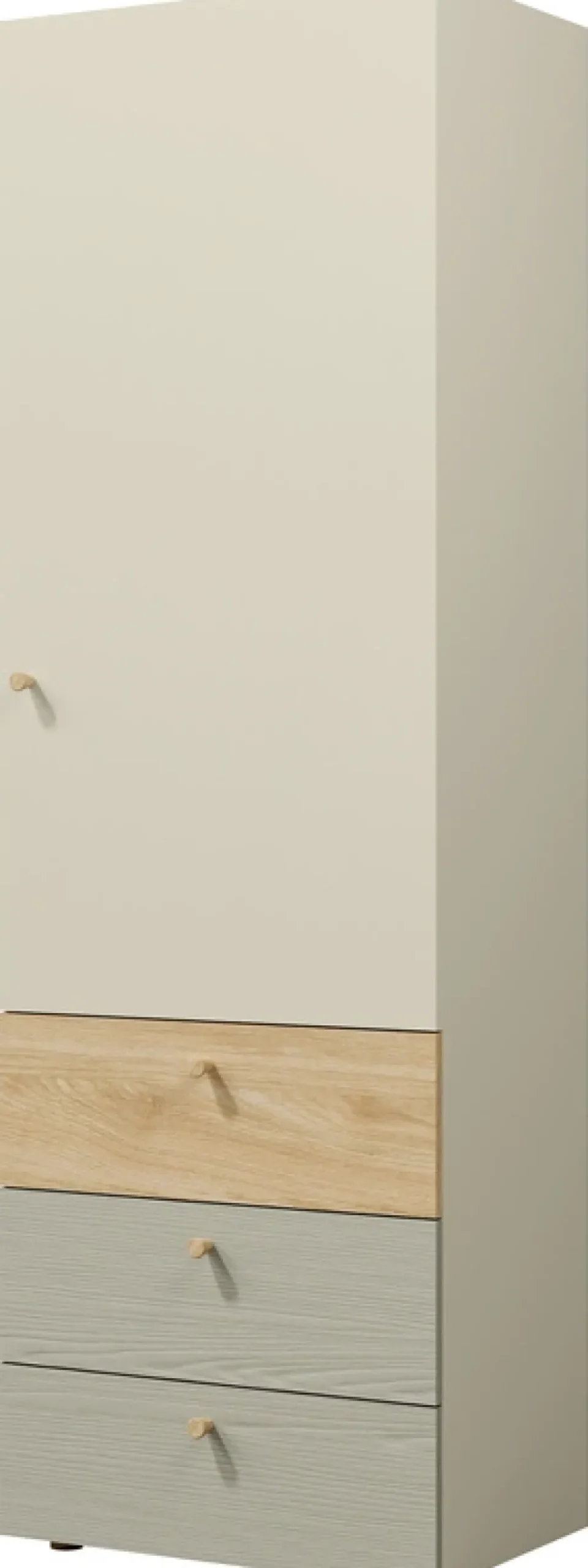 - Szafa młodzieżowa YOKO posiada 60 cm szerokości, które obejmują cztery półki na ubrania oraz trzy pojemne szuflady osadzone na prowadnicach kulkowych u dołu. Szafa wykonana z płyty laminowanej 16 mm, obrzeża wykończono okleiną PCV.