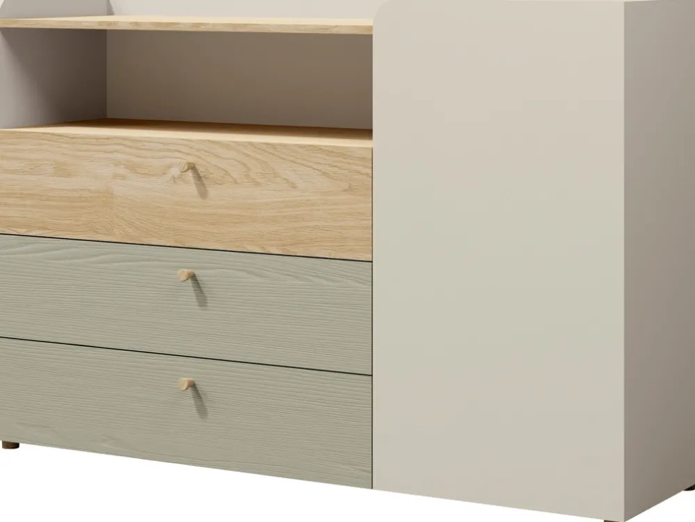 Dwie otwarte półki stanowią serce tej komody, oferując łatwy dostęp do ulubionych książek, dekoracji czy sprzętu multimedialnego. Dzięki temu każdy przedmiot ma swoje miejsce, a jednocześnie jest na wyciągnięcie ręki. To idealne rozwiązanie dla młodych ludzi, którzy lubią mieć wszystko pod kontrolą.