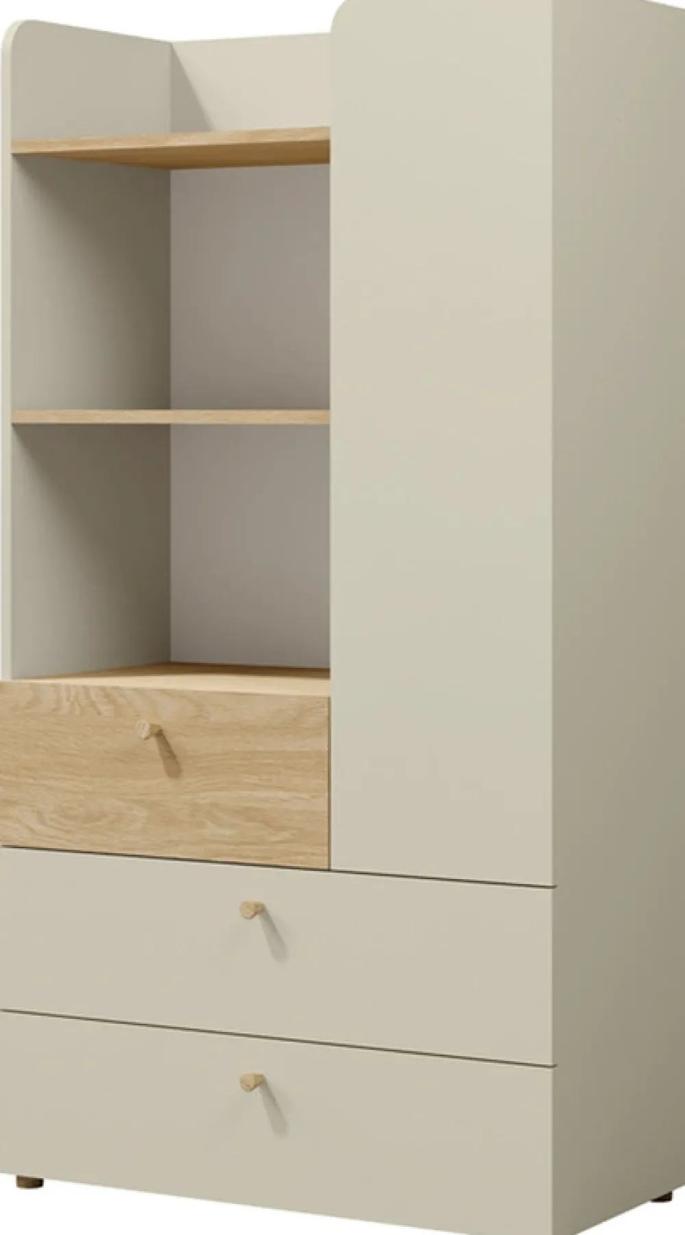 Pierwszą cechą, która przyciąga uwagę, są trzy otwarte półki, idealne do wyeksponowania ulubionych książek, pamiątek czy ozdób. To miejsce, gdzie Twoje dziecko może wyrazić swoją osobowość i zainteresowania, tworząc niepowtarzalną przestrzeń, która odzwierciedla jego pasje.