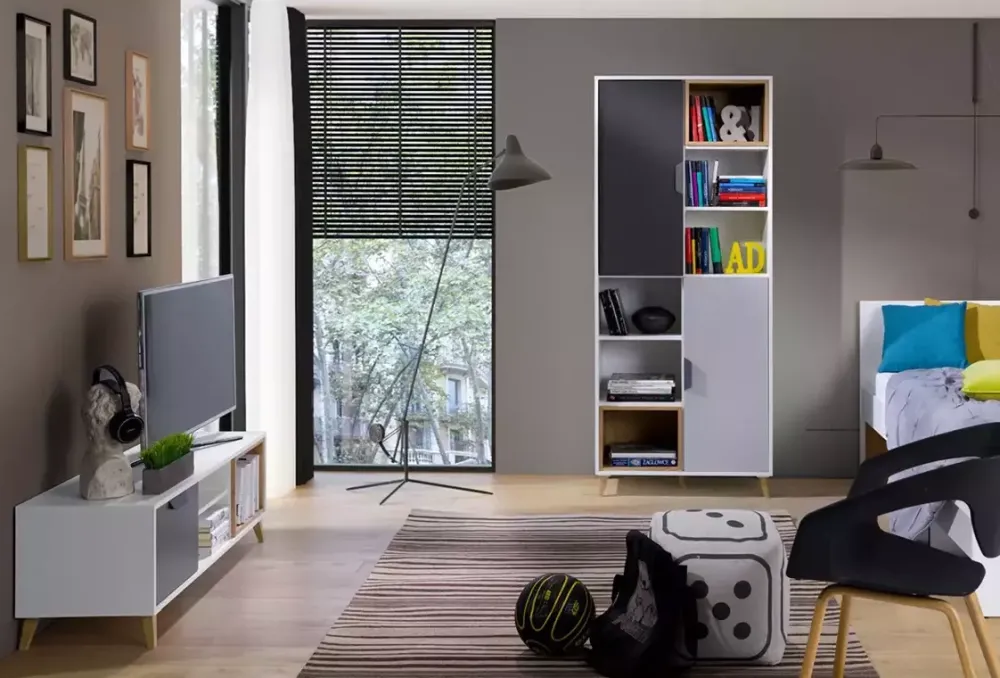Meble młodzieżowe z kolekcji JORK to piętnaście nowoczesnych brył takich jak; łóżko 90×200, szafa z półkami i szufladami, komoda wysoka i niska czy biurko młodzieżowe, z pomocą których stworzysz nietuzinkowe wnętrze dla nastolatka. Połączenie czterech dopasowanych do siebie kolorów nadało całej kolekcji oryginalnego charakteru, co dorastający człowiek z pewnością doceni. Meble systemowe to praktyczne rozwiązanie, ponieważ możesz dostawiać do posiadanych brył kolejne, z tej samej kolekcji, tworząc dodatkowe miejsce do przechowywania, nauki czy wypoczynku.