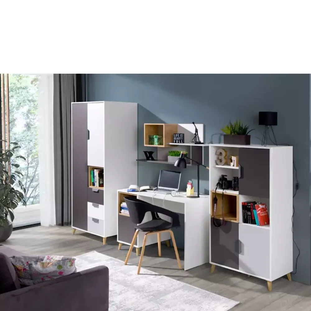 - W skład zestawu wchodzą; Szafa uchylna z szufladami, biurko, półka wisząca oraz niski regał z półkami.