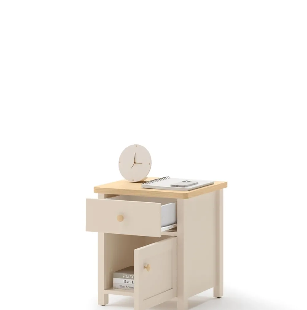 - Stolik nocny STORY w kolorze beż piaskowy/dąb vincenza bielona. Wyposażony w szufladę na prowadnicy rolkowej i zamykaną szafkę. Blat 25 mm, obrzeża ABS, tył z laminowanej płyty HDF. Stabilny mebel do sypialni, idealny na lampkę, książkę i drobiazgi.