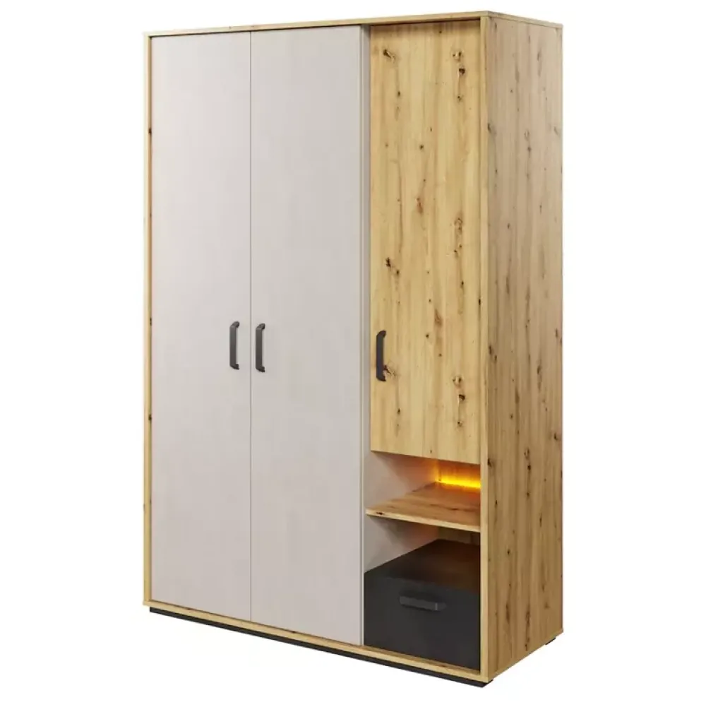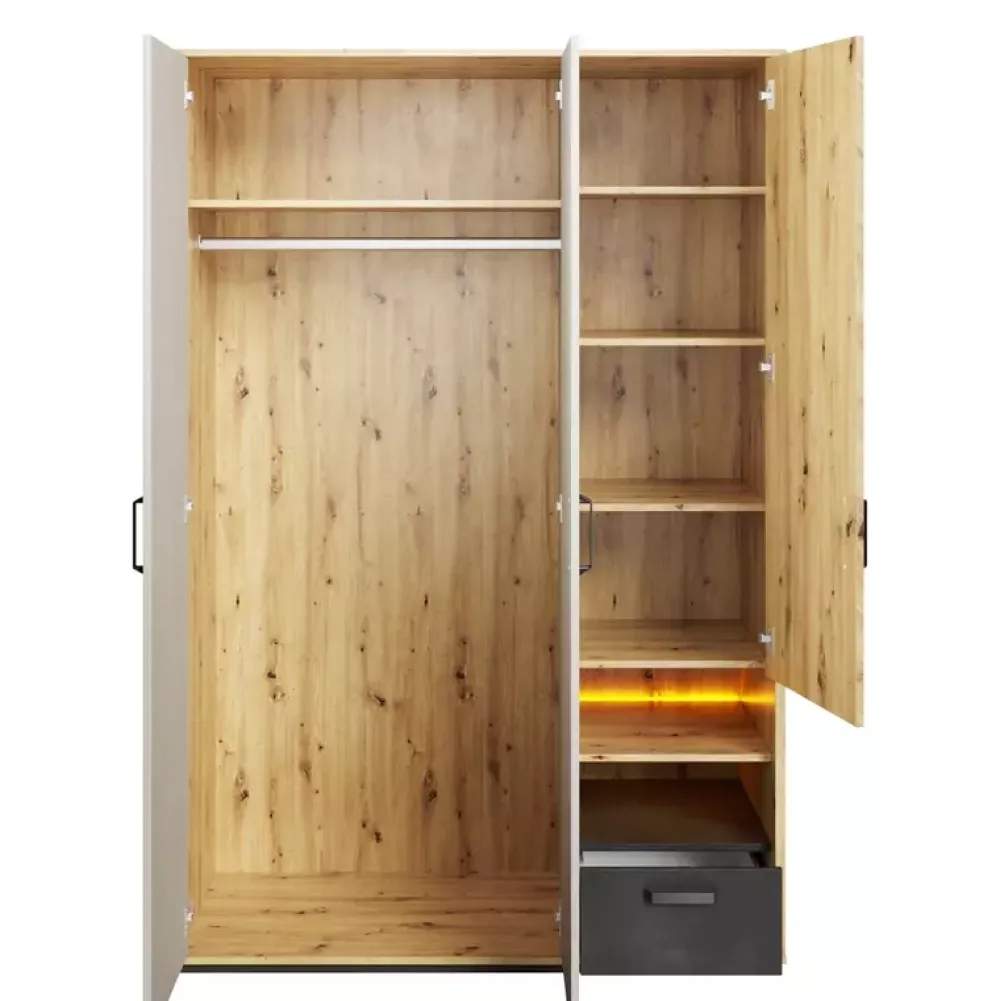 Za miejsce na ubrania odpowiada pojemna szafa trzydrzwiowa, w której znajdują się liczne półki oraz drążek na wieszaki z ubraniami o różnej długości.
