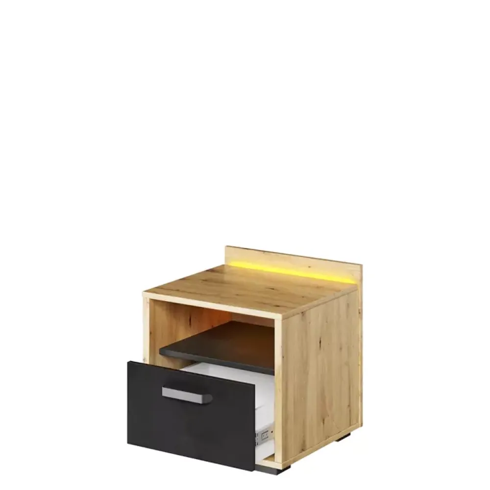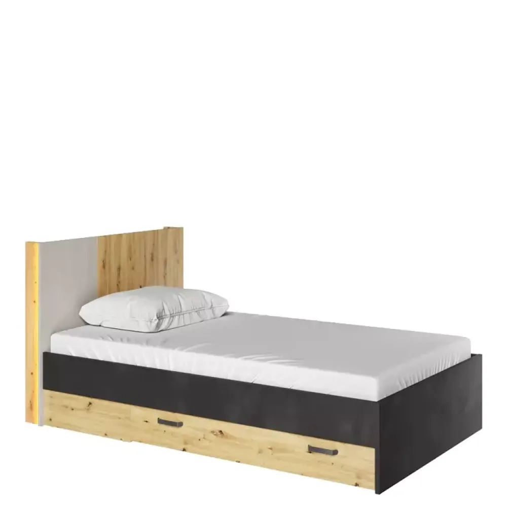 W zestawie znajduje się również łóżko o powierzchni spania 120×200 cm, wyposażone w szuflady, które pełnią funkcję pojemnika na pościel. Łóżko posiada również swoją szafkę nocną z pojemną szufladą osadzoną na prowadnicach kulkowych.
