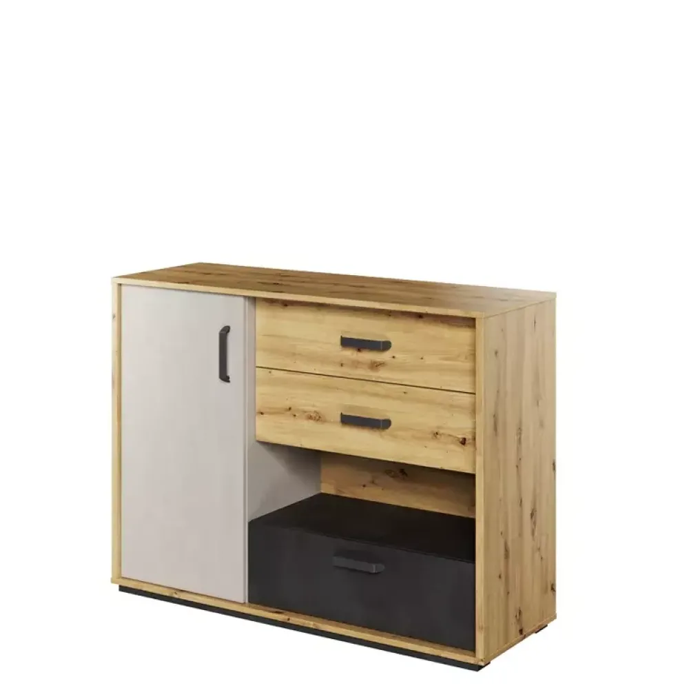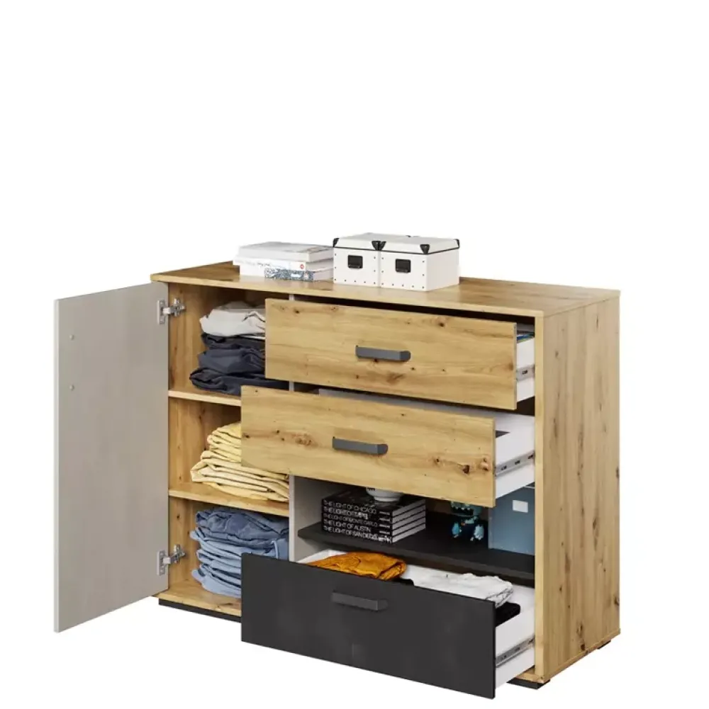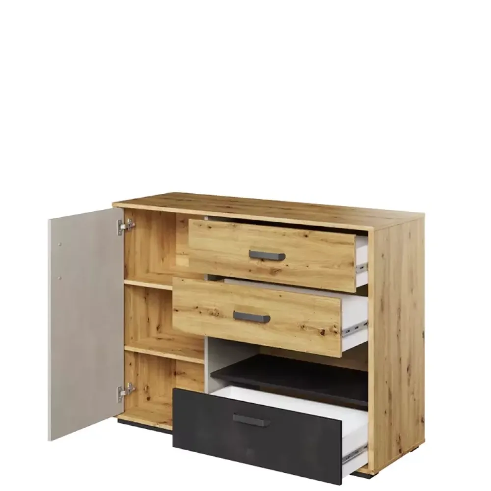 Nowoczesna komoda młodzieżowa posiada drzwi po lewej stronie, za którymi znajdują się trzy poziomy gotowe na zagospodarowanie elementami twojej garderoby.