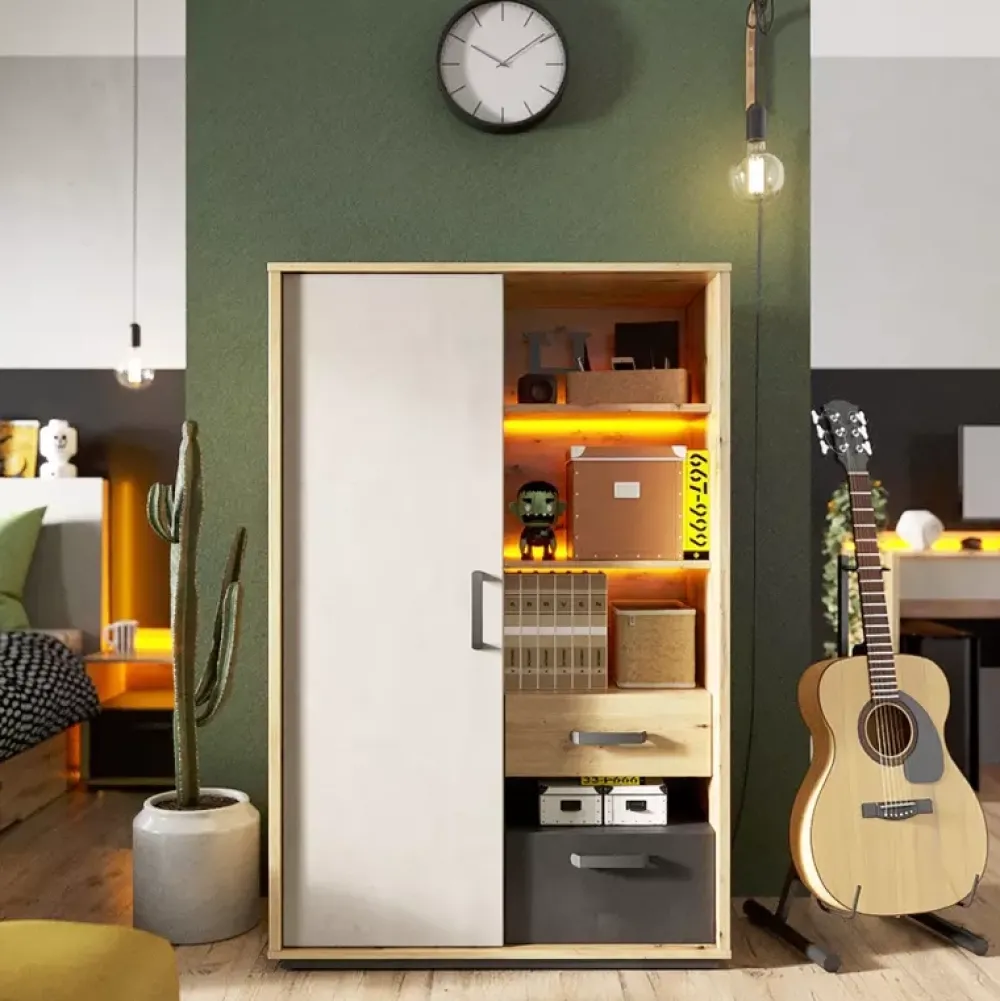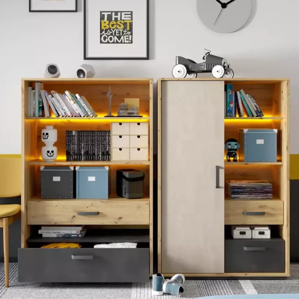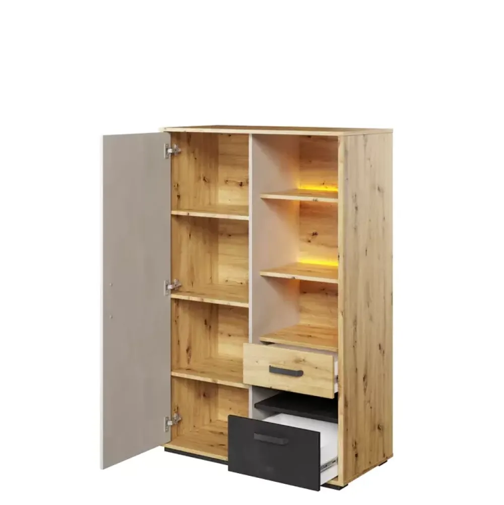 Komoda do pokoju młodzieżowego posiada drzwi po lewej stronie, za którymi znajdują się cztery poziomy gotowe na zagospodarowanie elementami garderoby, natomiast po prawej stronie znajdują się dwie półki z podświetleniem LED o ciepłej barwie, które doskonale podkreśli dekory oraz książki umieszczone na nich.