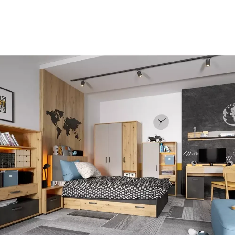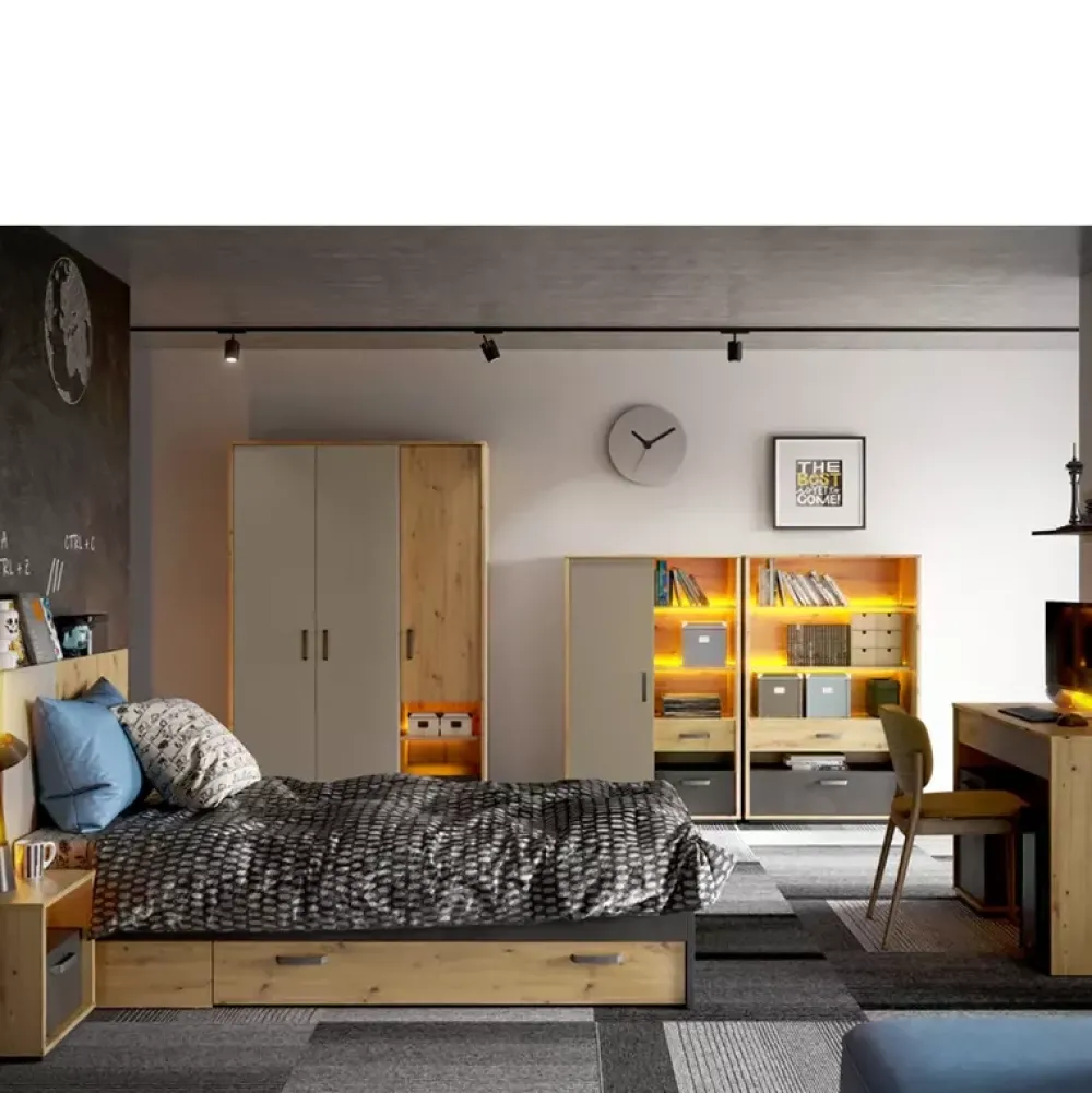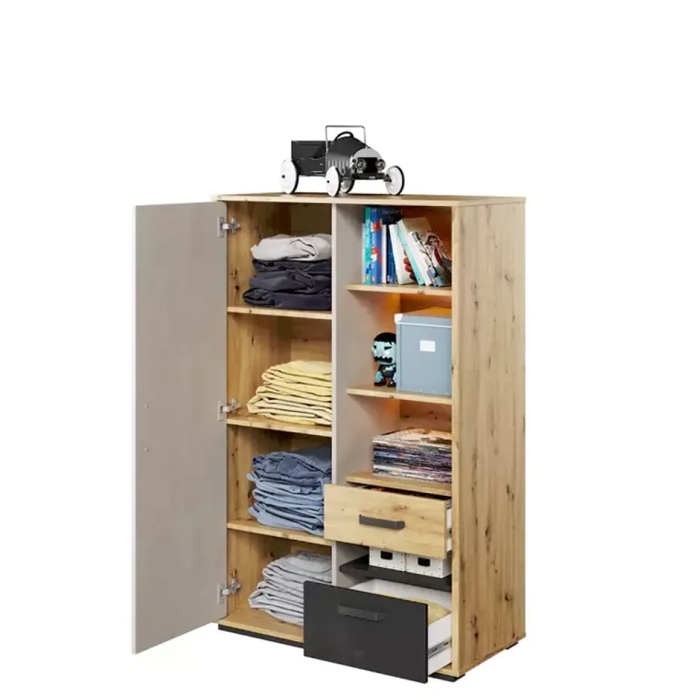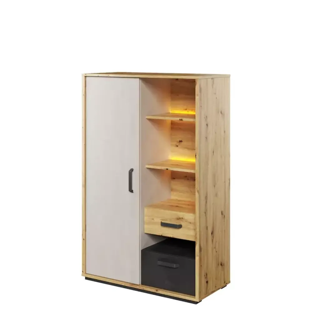 Komoda do pokoju młodzieżowego posiada drzwi po lewej stronie, za którymi znajdują się cztery poziomy gotowe na zagospodarowanie elementami garderoby, natomiast po prawej stronie znajdują się dwie półki z podświetleniem LED o ciepłej barwie, które doskonale podkreśli dekory oraz książki umieszczone na nich.