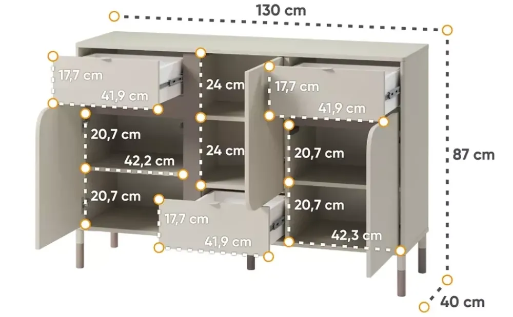 Cztery półki umożliwiają elastyczną organizację przestrzeni. Dzięki nim każdy przedmiot znajdzie swoje miejsce, a porządek w pokoju stanie się prostszy do utrzymania.