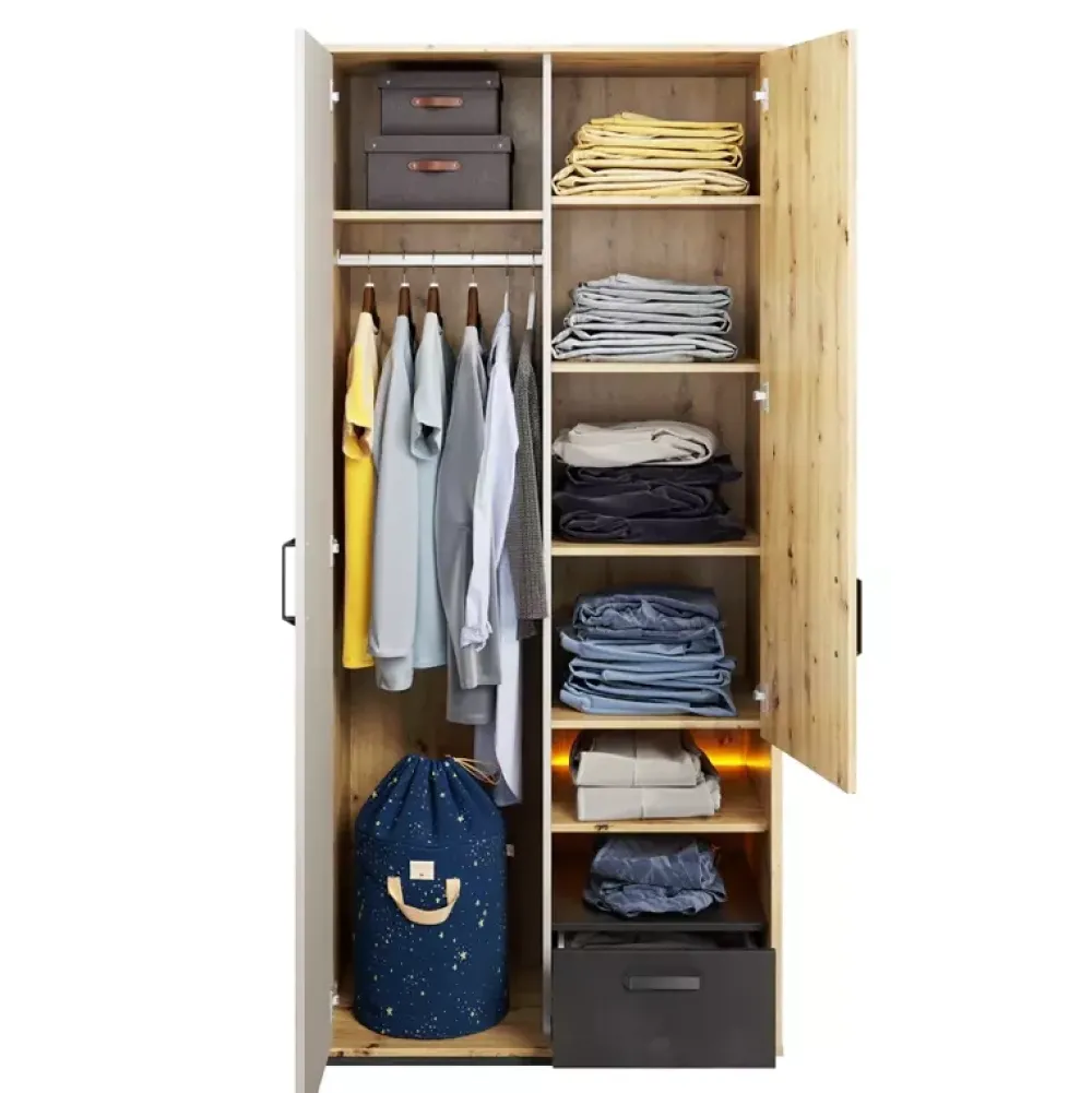 Nowoczesna szafa do pokoju młodzieżowego posiada również drzwi po prawej stronie, za którymi znajdują się cztery poziomy gotowe na zagospodarowanie elementami garderoby.