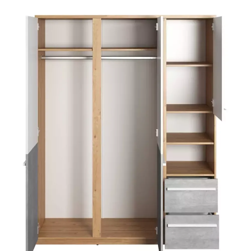 Wewnątrz znajduje się drążek na wieszaki, na którym można powiesić koszule, bluzy i płaszcze. Po prawej stronie szafy znajdują się półki, na których można przechowywać buty, torby, a także składane ubrania. Szafa ta posiada również dwie szuflady osadzone na prowadnicach kulkowych, które są bardzo praktyczne do przechowywania bielizny, skarpet czy innych mniejszych rzeczy.