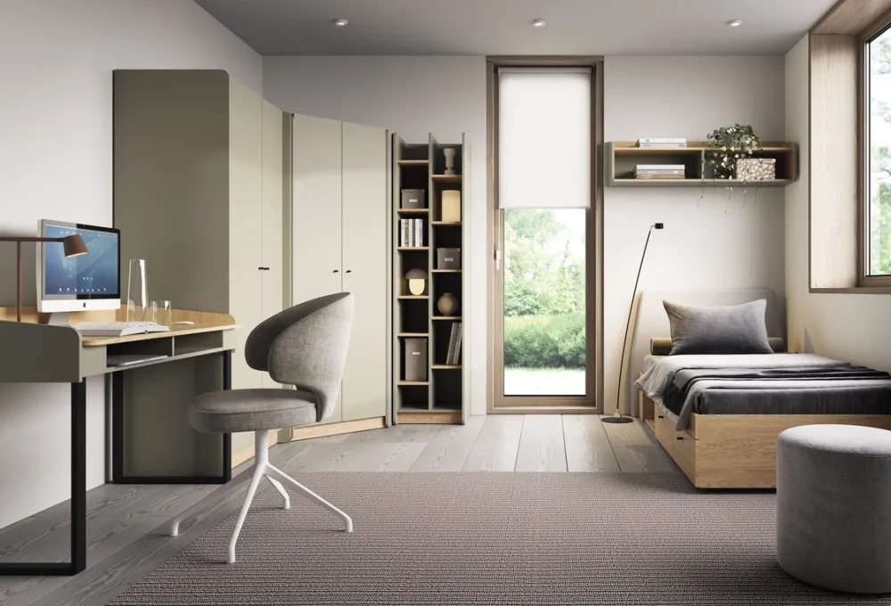 - Meble do pokoju młodzieżowego ALDENO w kolorze eukaliptus + dąb baltic dune. W skład kompletu mebli wchodzi: łóżko o powierzchni spania 90×200 cm, szafa narożna, szafa uchylna, otwarty regał z półkami, biurko oraz praktyczna półka.