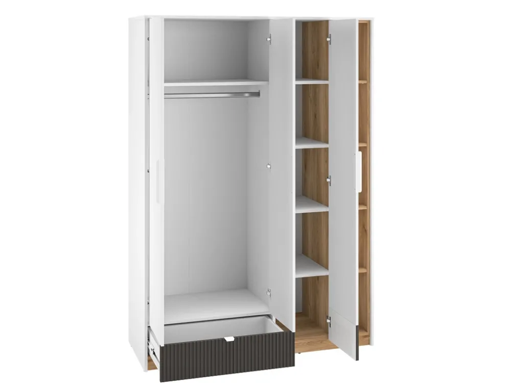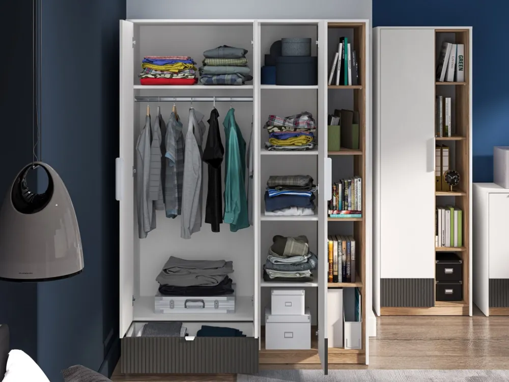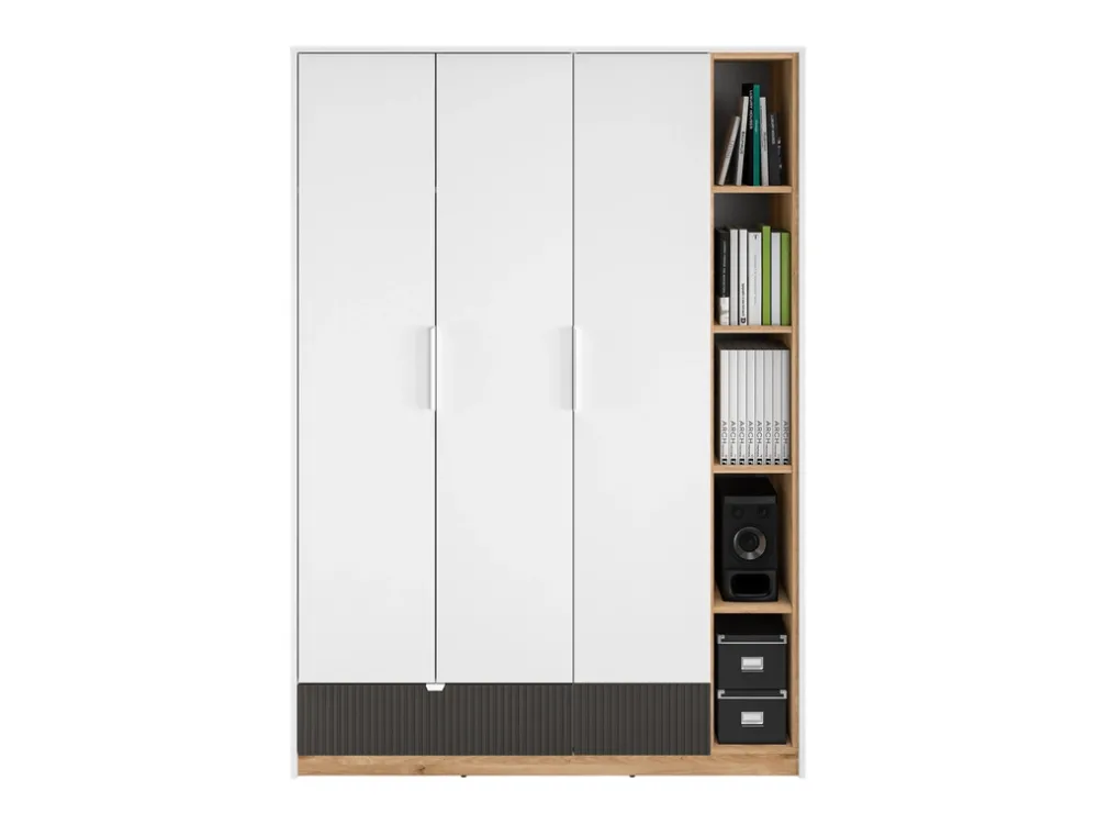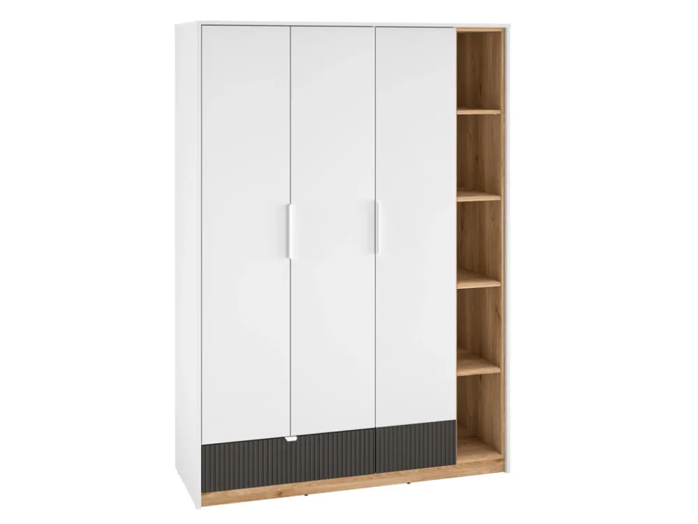 Dodatkowym atutem szafy są trzy otwarte półki po prawej stronie. To doskonałe miejsce na ulubione książki, pamiątki czy dekoracje, które nadadzą wnętrzu osobisty charakter. Zorganizuj przestrzeń według swoich potrzeb i wyraź swoją indywidualność!