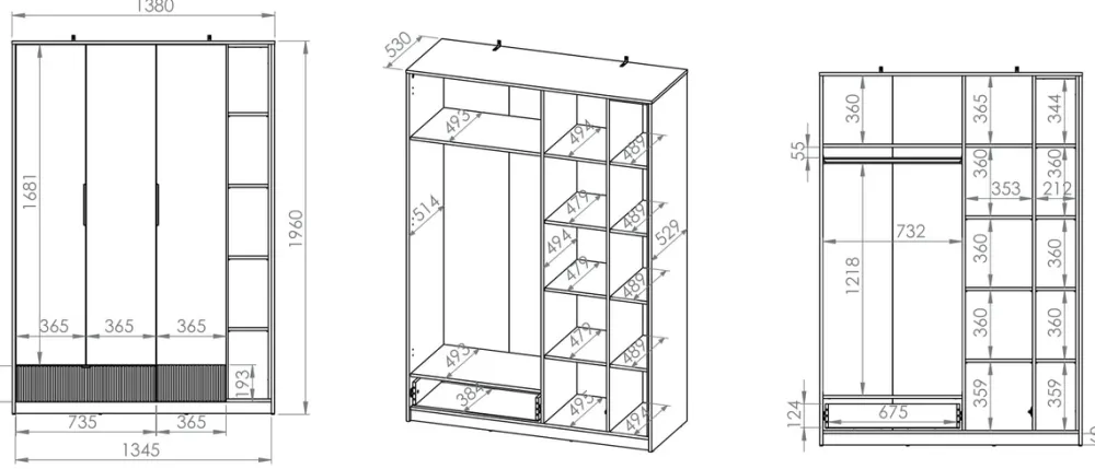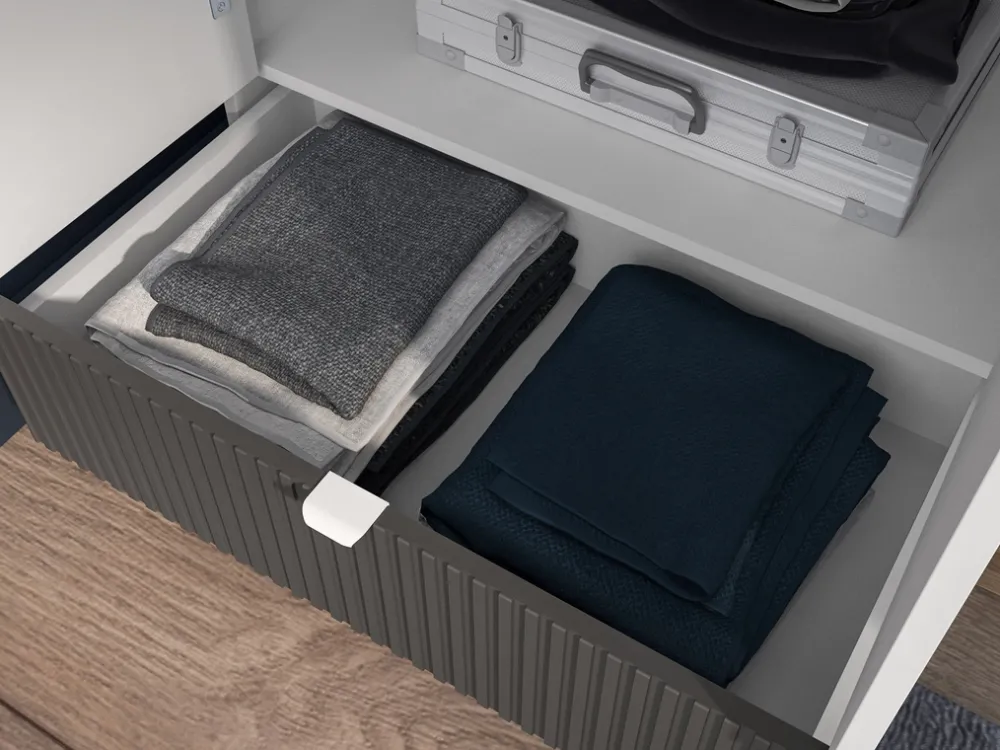 Za prawymi drzwiami umieściliśmy pięć przestronnych półek, które pomieszczą wszelkie niezbędne przedmioty – od odzieży, przez akcesoria, aż po sezonowe dodatki. Dzięki temu Twoje rzeczy zawsze będą na swoim miejscu, a utrzymanie porządku stanie się łatwiejsze niż kiedykolwiek.