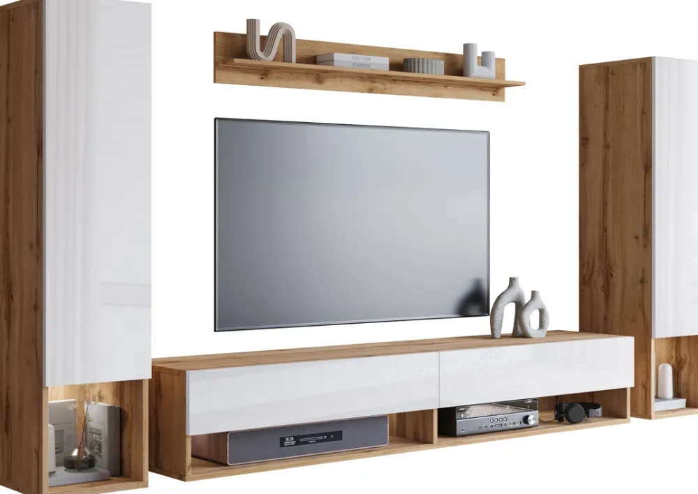 - Odmień swój salon z nowoczesną meblościanką do salonu MADERA! Nowoczesna meblościanka składa się z dwóch wiszących słupków, szafki RTV, a także półki. Meble otwierają się za pomocą wystającej krawędzi. Meblościanka do salonu w kolorze dąb wotan/biały.