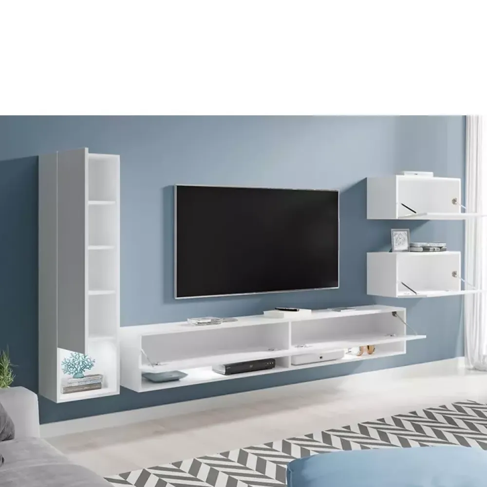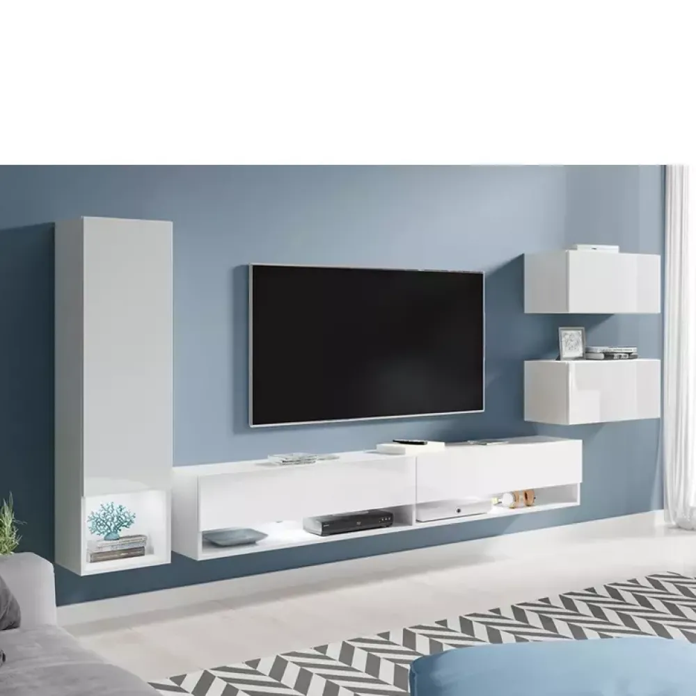 - Biała meblościanka w połysku z serii MADREA zawiera dwa barki wiszące, słupek wiszący z czterema półkami i wiszącą szafkę rtv. Białe meble w połysku pomogą ci stworzyć nowoczesną aranżację.