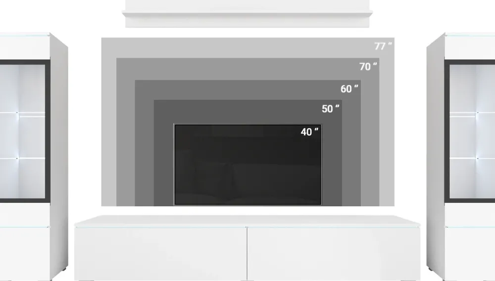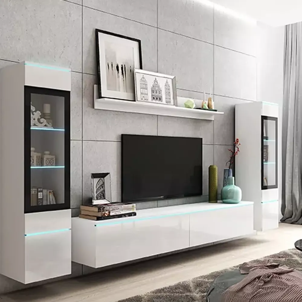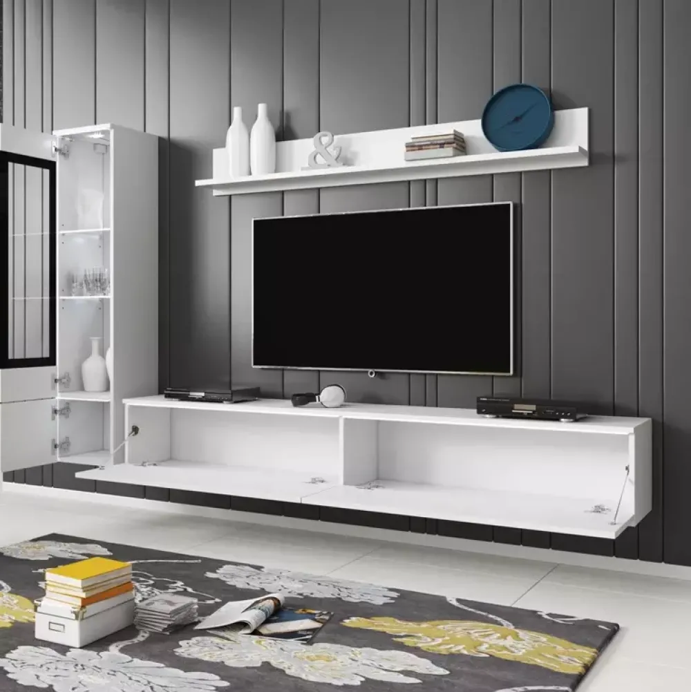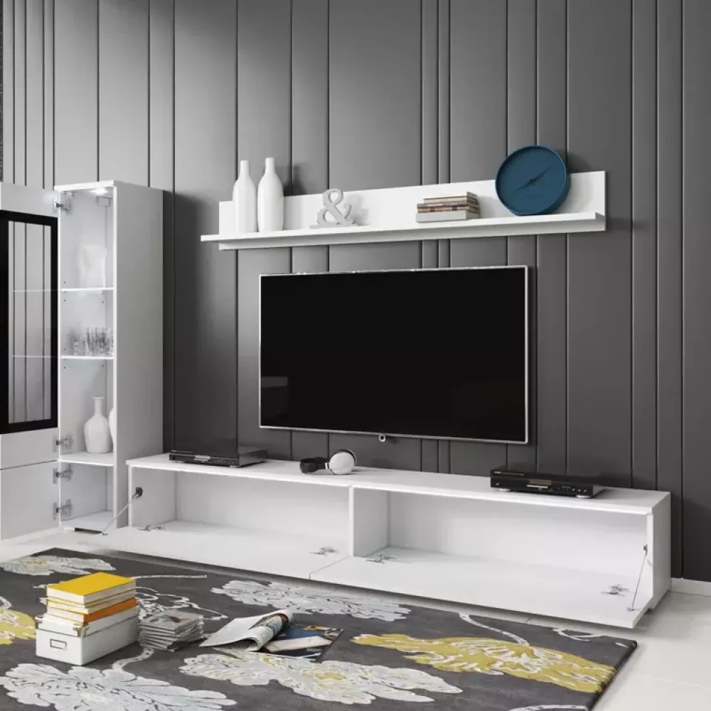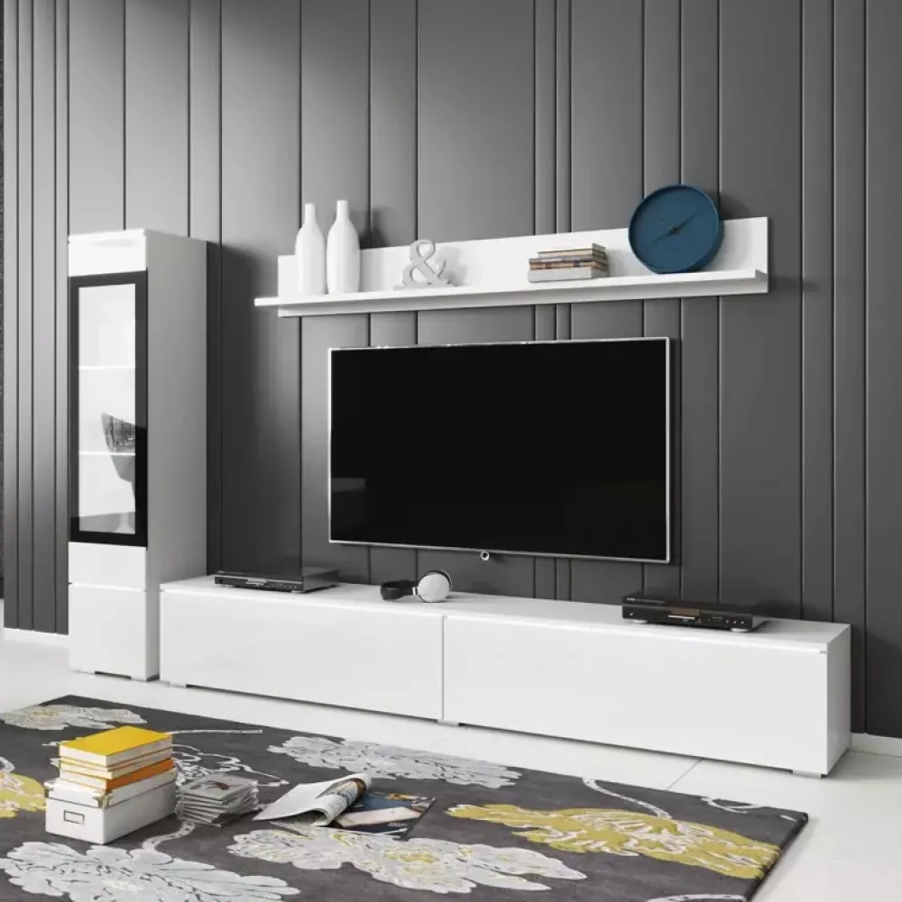 Meblościanka pokojowa VELLORE XL to idealne rozwiązanie do nowoczesnego salonu. Witryny mają przeszklone drzwi, za którymi kryją się dwie szklane półki z możliwością podświetlenia oświetleniem led, poniżej jedna półka z płyty laminowanej, a w dolnej części z oddzielnym frontem znajdują się wnęki. Duża szafka pod telewizor ma 180 cm szerokości i podzielono ją wewnątrz na dwie oddzielne części. Zarówno te szklane witryny jak i szafka rtv mogą być wiszące lub stojące. W meblościance znajduje się także wisząca półka o szerokości 140 cm, która stworzy miejsce to ekspozycji zdjęć i rodzinnych pamiątek.