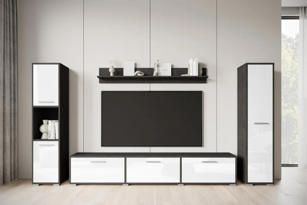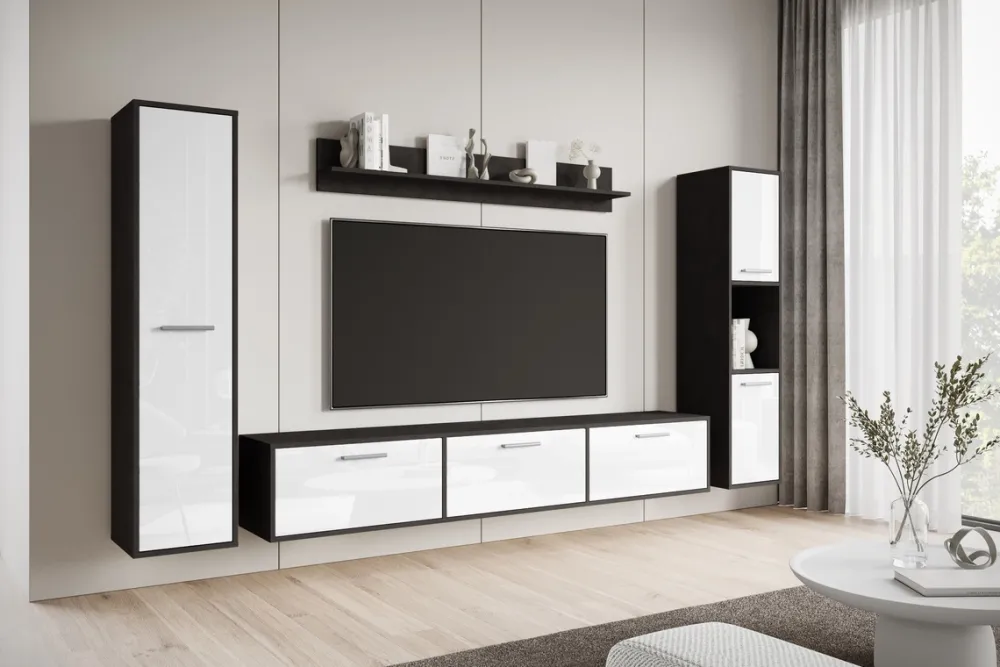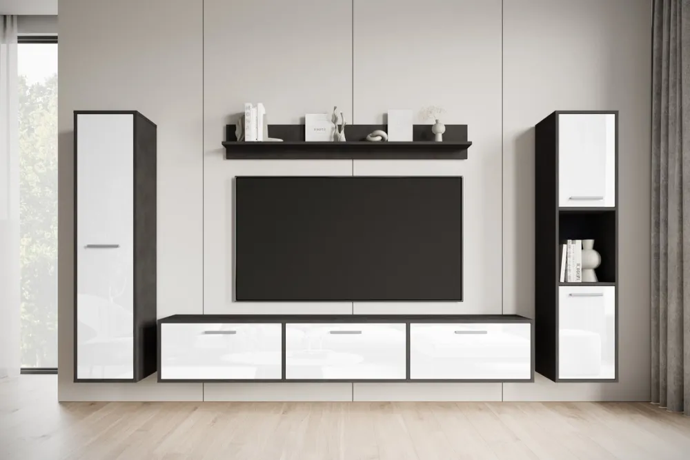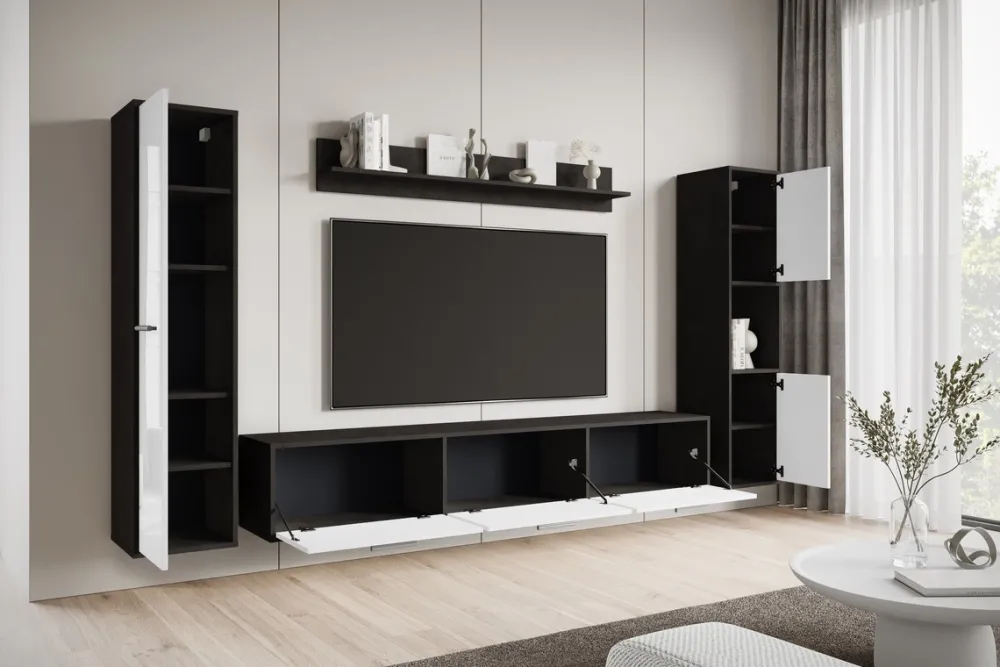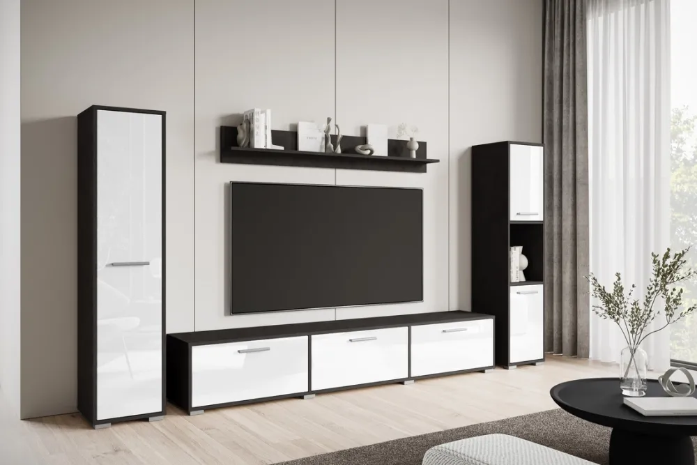 Meblościanka do salonu BUENO to wyjątkowy zestaw mebli, który łączy w sobie nowoczesny design z wysoką funkcjonalnością. Dzięki swojej eleganckiej, czarnej kolorystyce, meble te doskonale komponują się z różnymi stylami wnętrz, od minimalistycznych po bardziej klasyczne aranżacje. Wysokiej jakości materiały oraz staranne wykonanie gwarantują trwałość i estetyczny wygląd przez wiele lat.