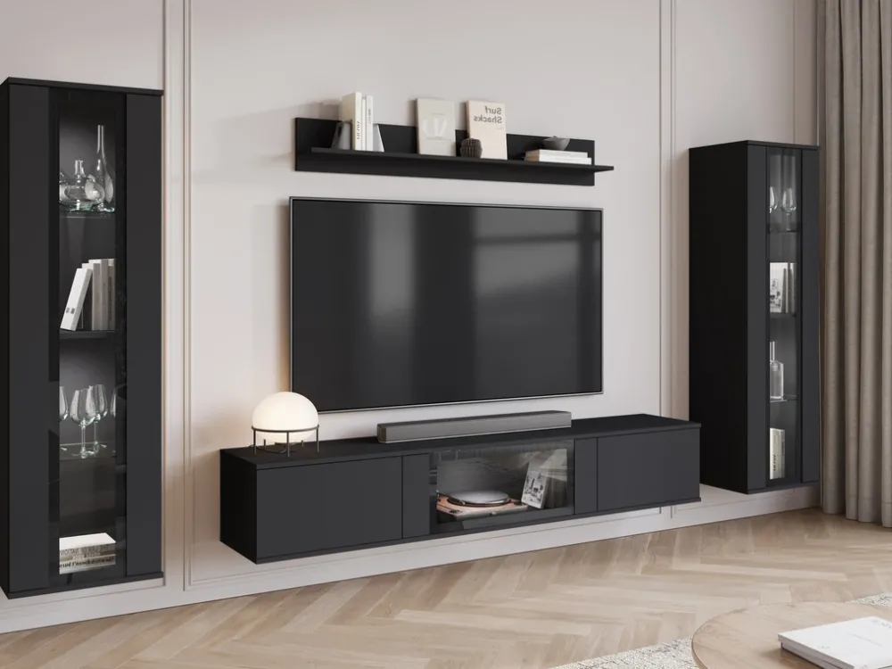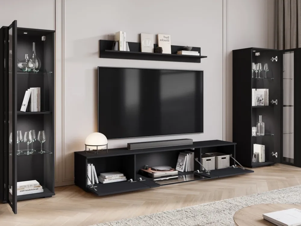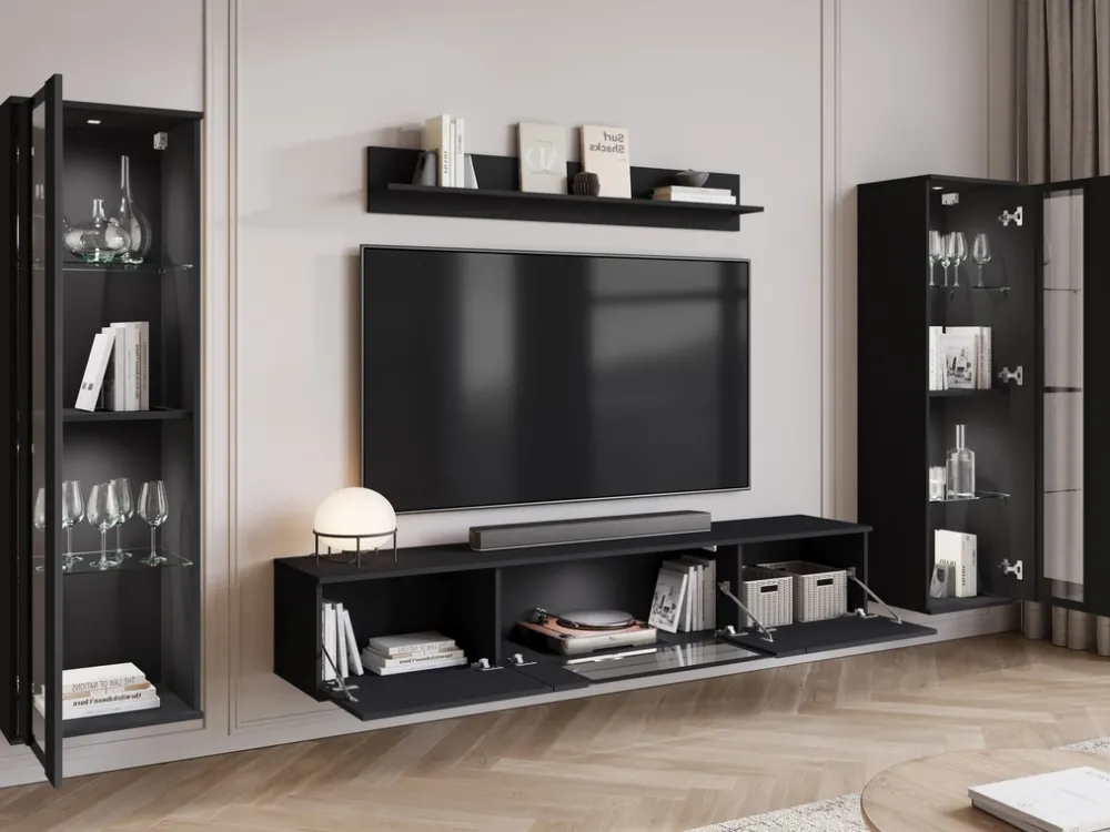 - Meblościanka CAVIO łączy czarne akcenty i szklane elementy, tworząc elegancką aranżację. W skład zestawu wchodzą dwie witryny, szafka RTV z trzema półkami i wisząca półka. Opcjonalne oświetlenie LED i system push-to-open zwiększają funkcjonalność.